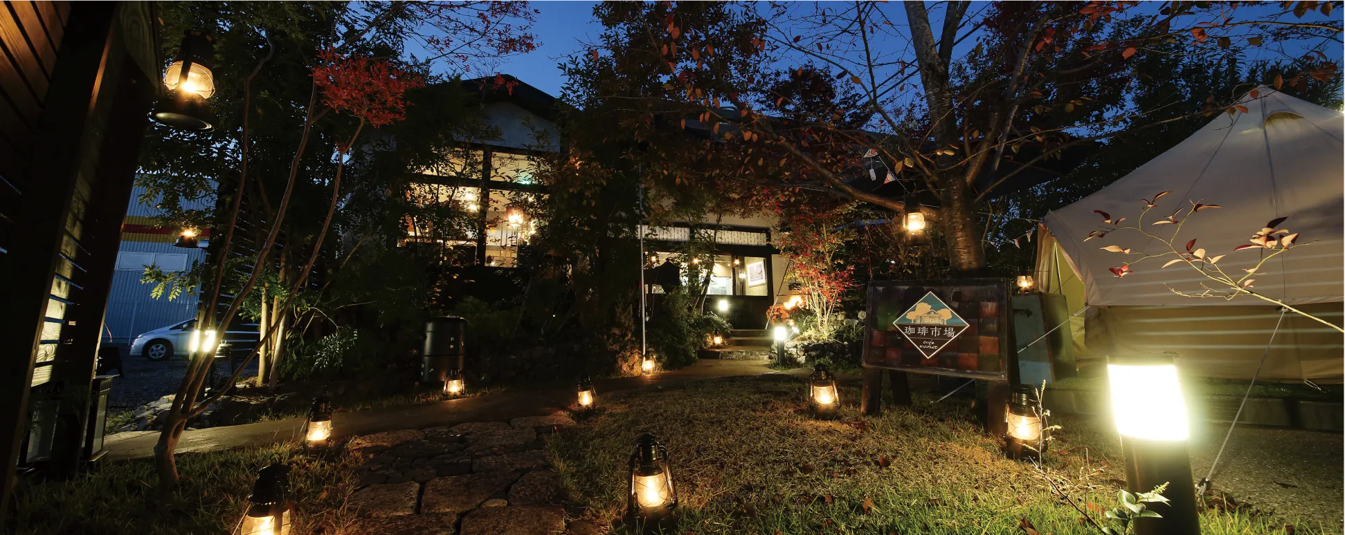 当店は、ゆったりとした空気の流れるお庭や、ぬくもりある店内、グランピングテント内でのお食事など、慌ただしい日常から少し離れあなただけのゆっくりとした時間をお過ごしいただけるようなレストランになっております。