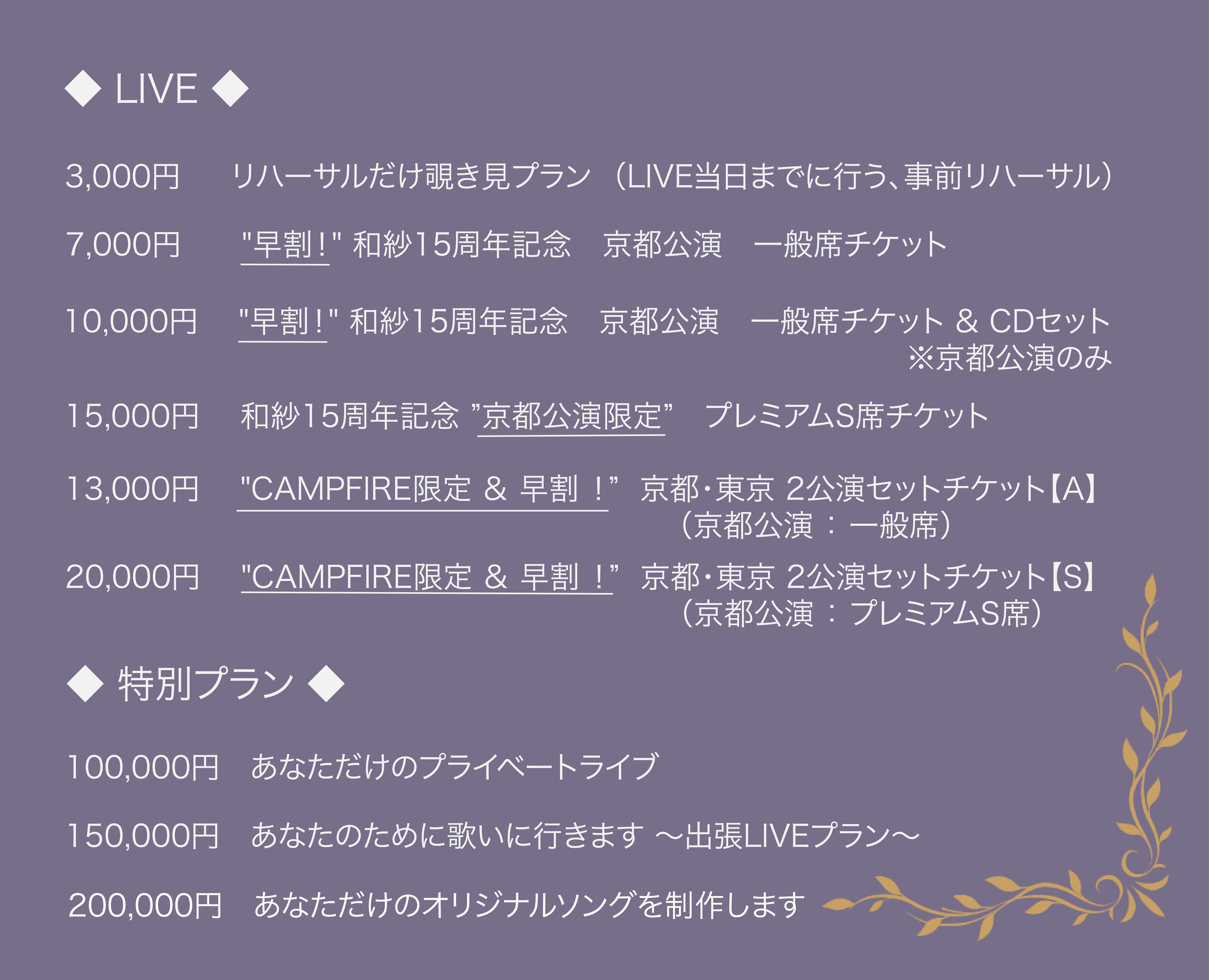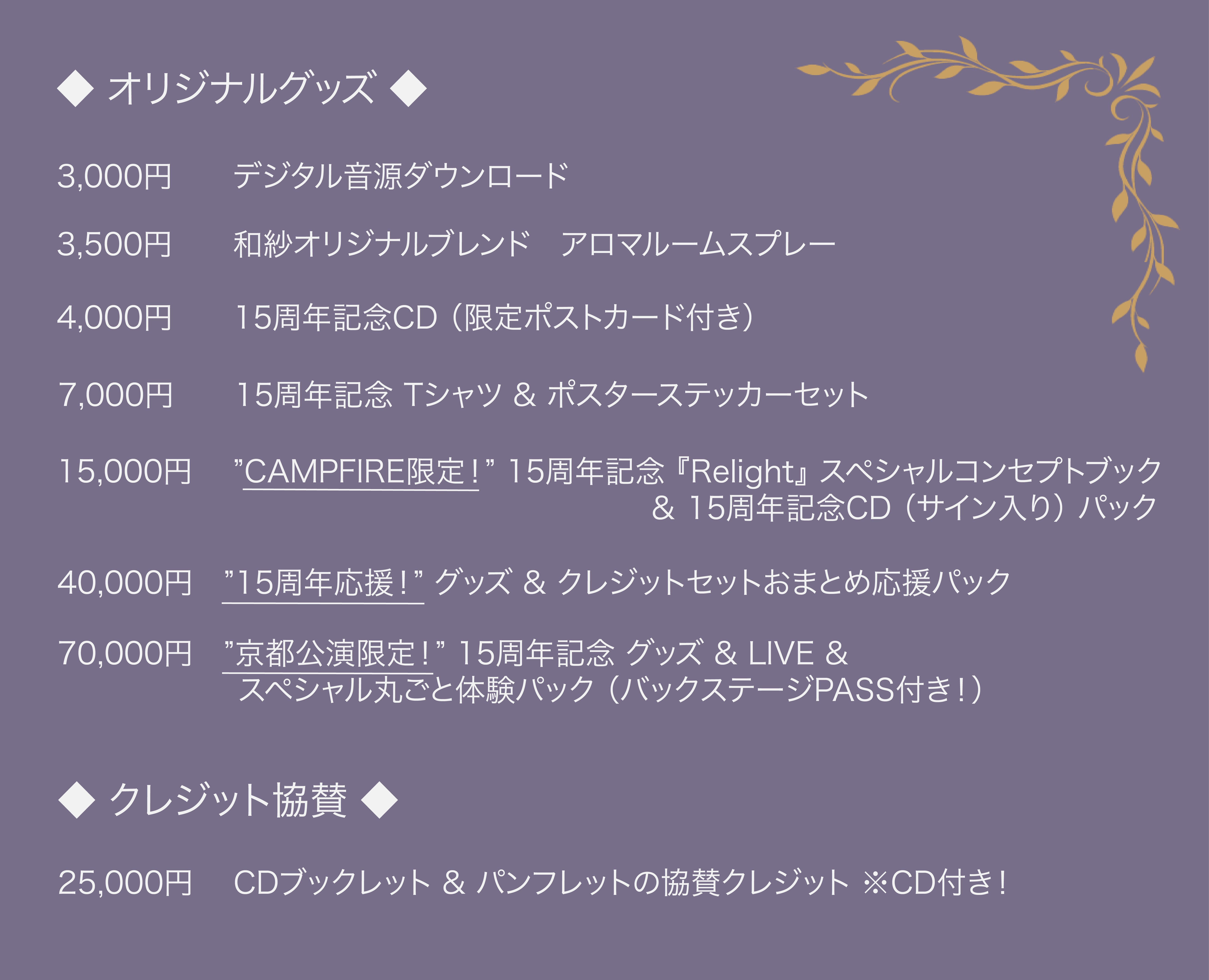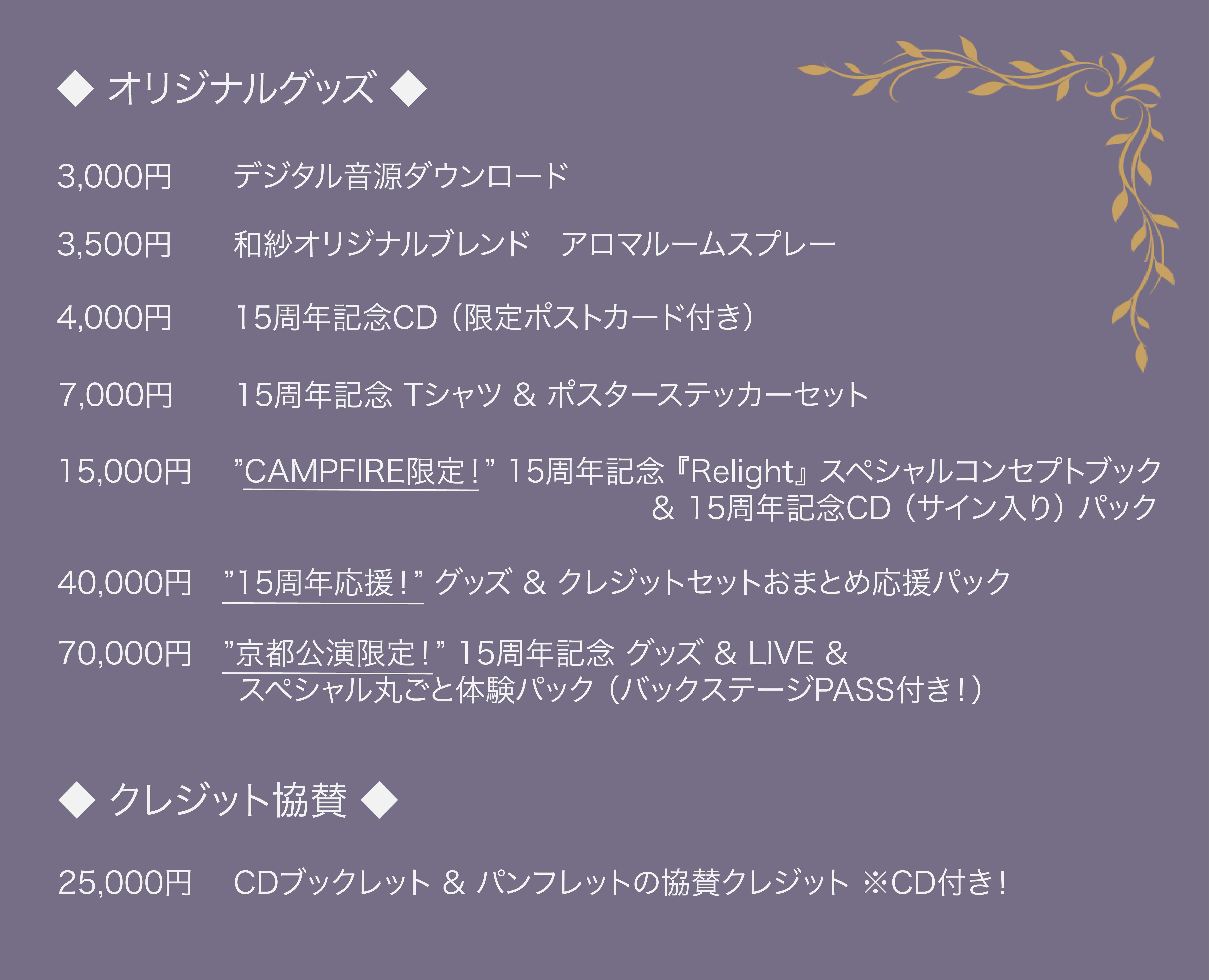 キャンプファイヤー限定販売となる、ライブ写真や未公開イメージ写真などを詰め込んだ『15周年記念特別 コンセプトブック』や、7月発売予定のNew CD『Relight』、記念Tシャツ等のグッズプラン、7月20日開催LIVEの ”プレミアムS席"チケット、LIVEとCDがセットになったお得なセットプラン、ここだけの特別プランもご用意しました!