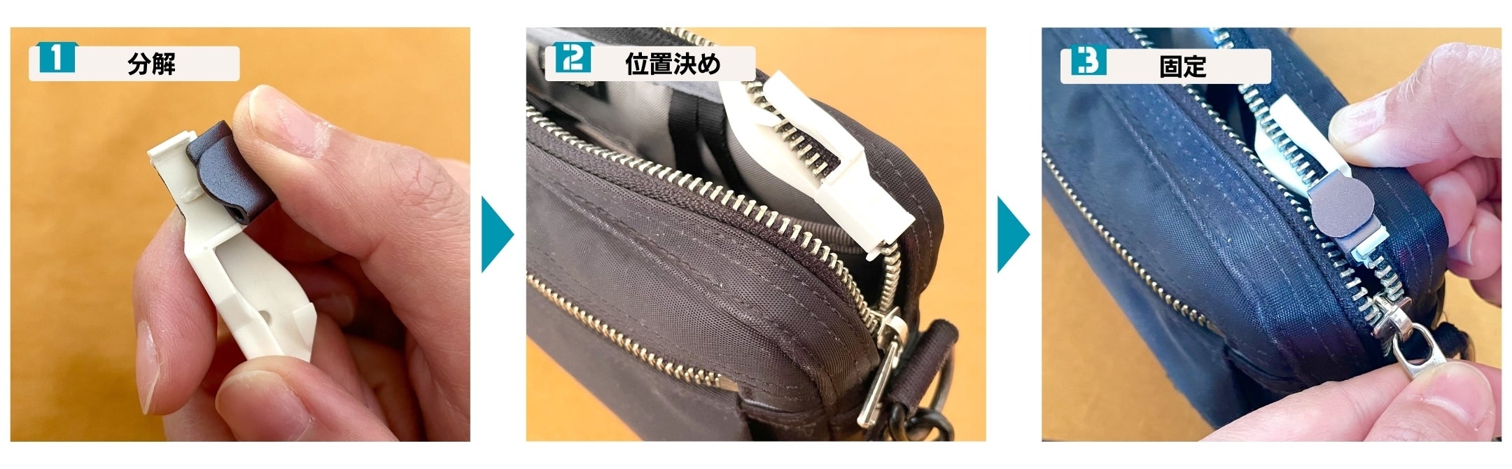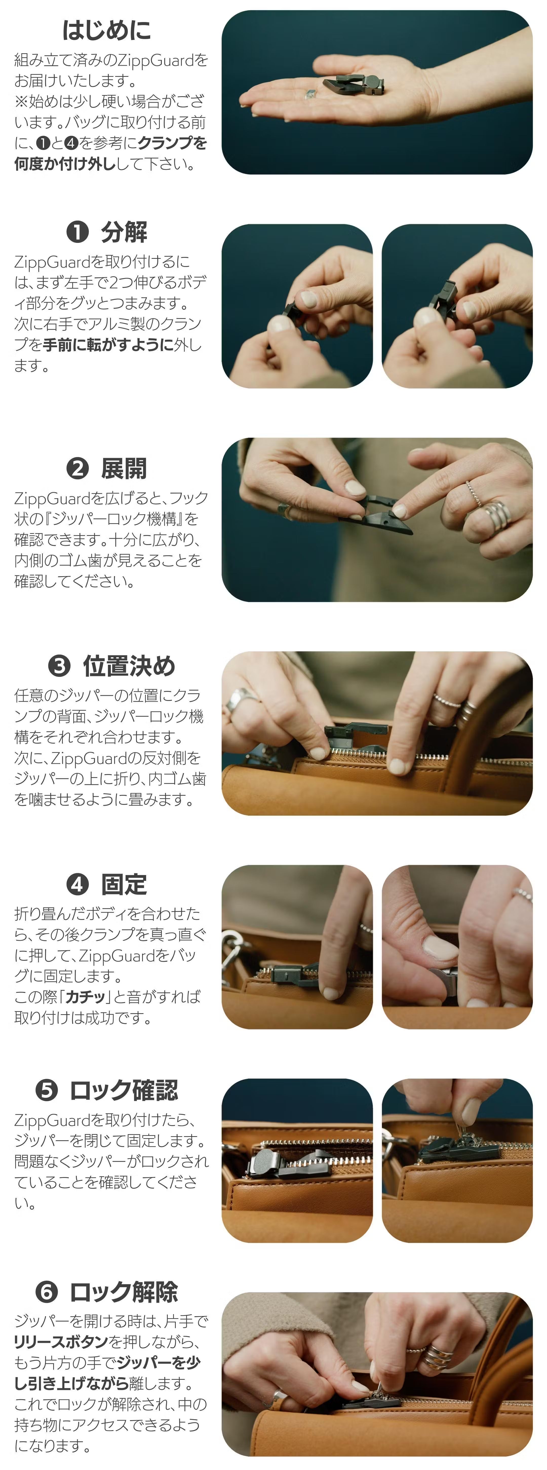 およそ1分以内の取り付けで本人以外は簡単にジッパーを開けられなくなるので、意図せず急に人混みに入ってしまった際のリスクや心配事を大きく低減することが可能です。