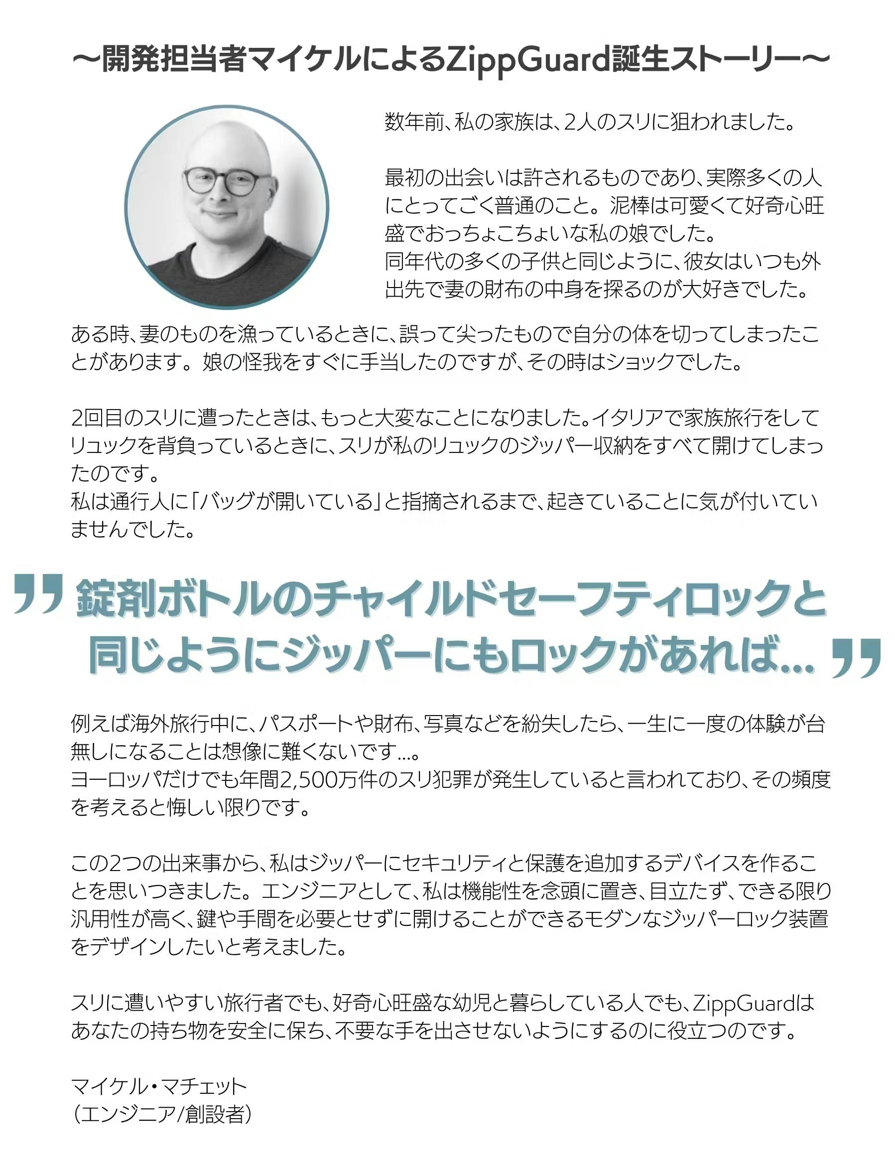 今回の『ZippGuard(ジップガード)』についてですが、商品説明内でもお伝えしています様に「日本人だからこそ」スリなどの犯罪に対して、もっと危機管理を持っていただきたいという想いがあり、この機会にぜひCAMPFIREにてご紹介したいと思った次第です。
