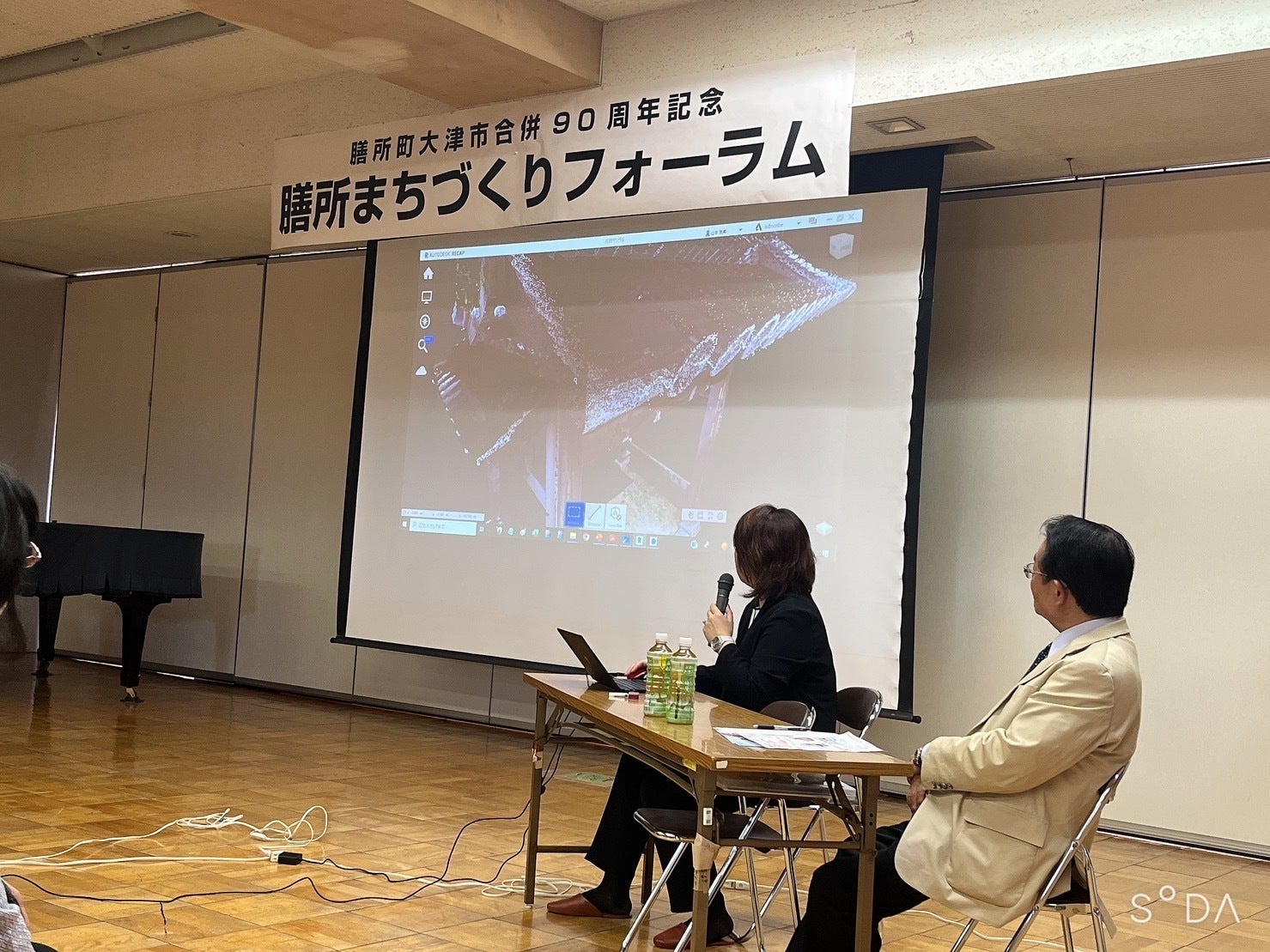 フォーラムにご参加くださった約70名の方に、膳所城 VR Lab. の設立経緯や具体的な活動内容などを発表しました。どのようにモデリングを進めているのか、実際にソフトを動かしてみたり事前に準備していた作業画面の映像をお見せしたりしながらご説明しました。