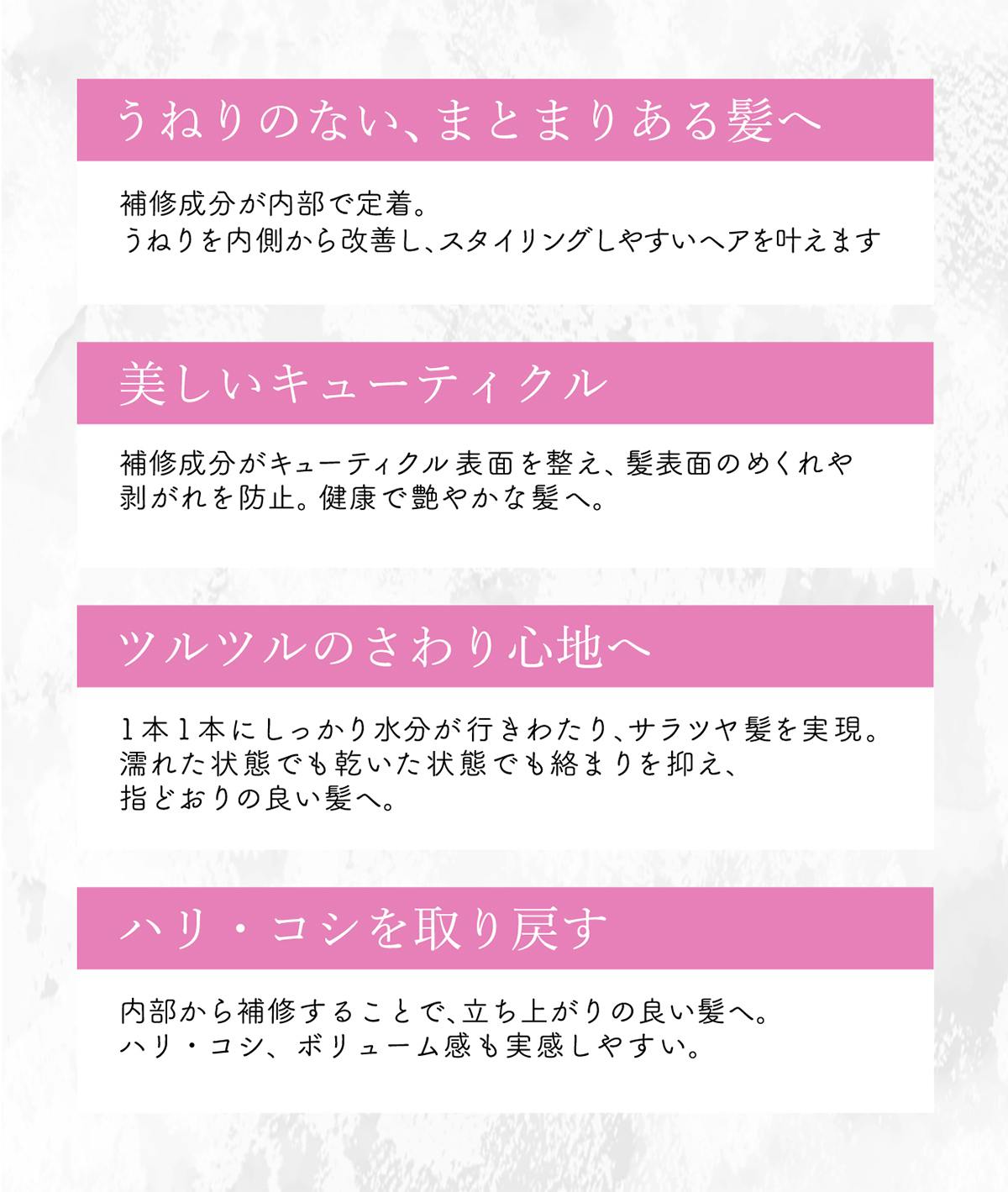 高濃度のナノリペアELが、髪の内部までしっかり漫透する洗い流さないタイプのトリートメントです。