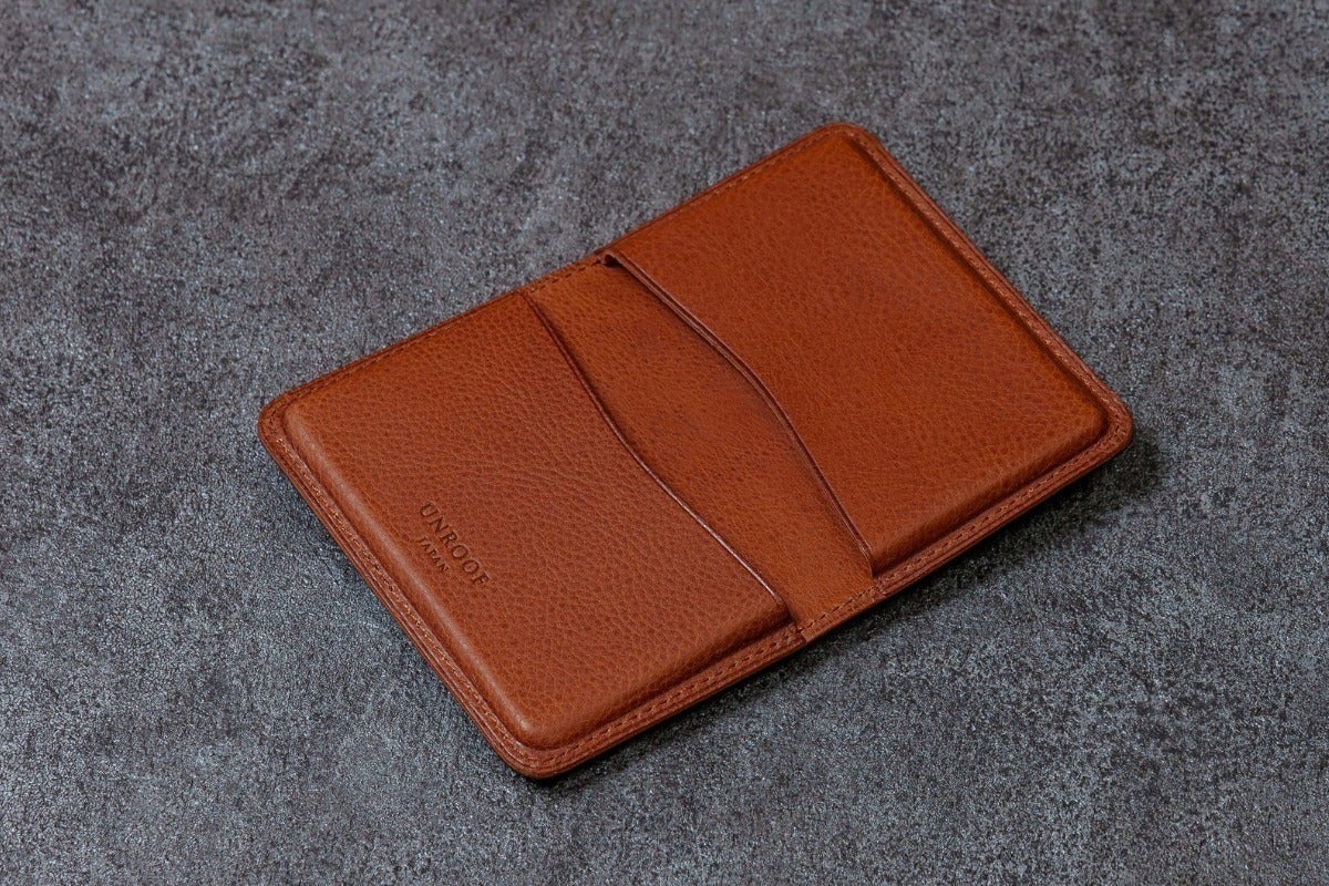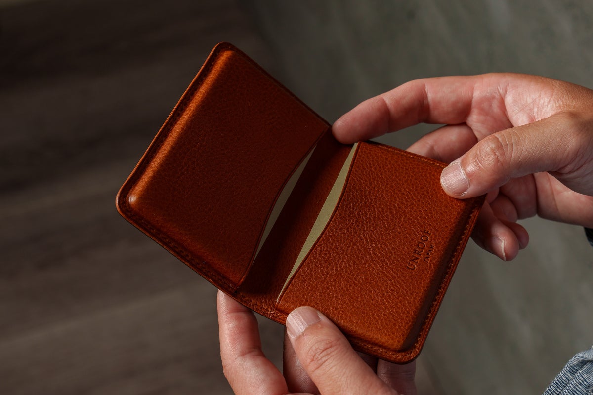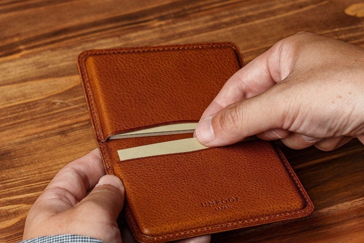 革本来の柔らかさと革表面の美しさを利用し、無駄な装飾をなくすことで薄く・コンパクトな名刺入れを実現。