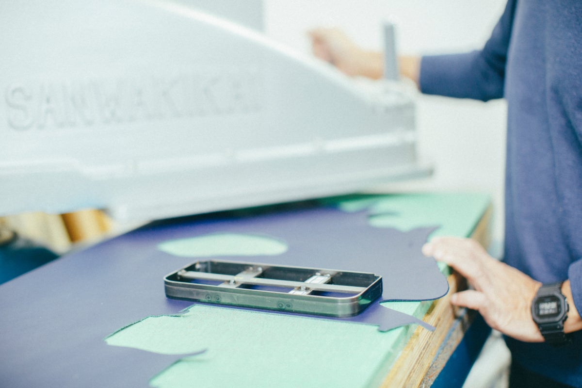 UNROOFでは商品サンプルを作るときにまず手断ち(てだち:手で革を切る)で設計しています。