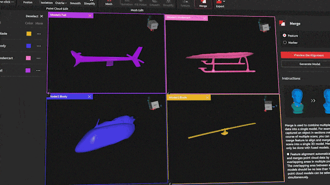 MIRACOには直感的なUIを備えたソフトウェアが搭載されており、キャプチャとモデルの後処理が簡単に行えます。移動中に融合編集、メッシュ編集を行い、プロジェクトをPCに転送することなくモデルの品質を確認できます。STL、PLY、OBJなどのタイプでスキャンデータをエクスポートし、ほとんどの3Dモデリングソフトとの互換性があります。