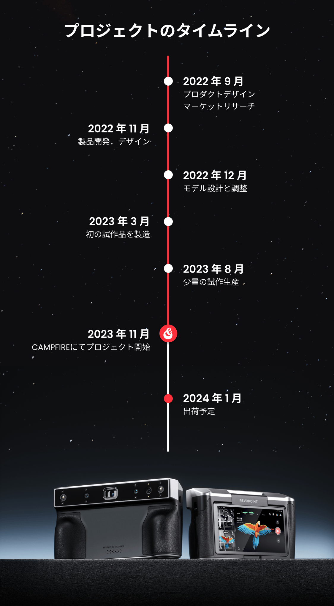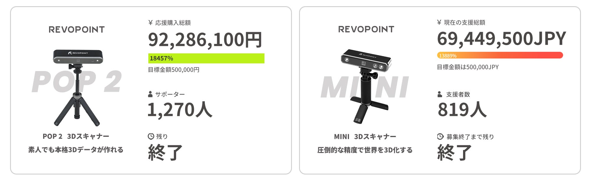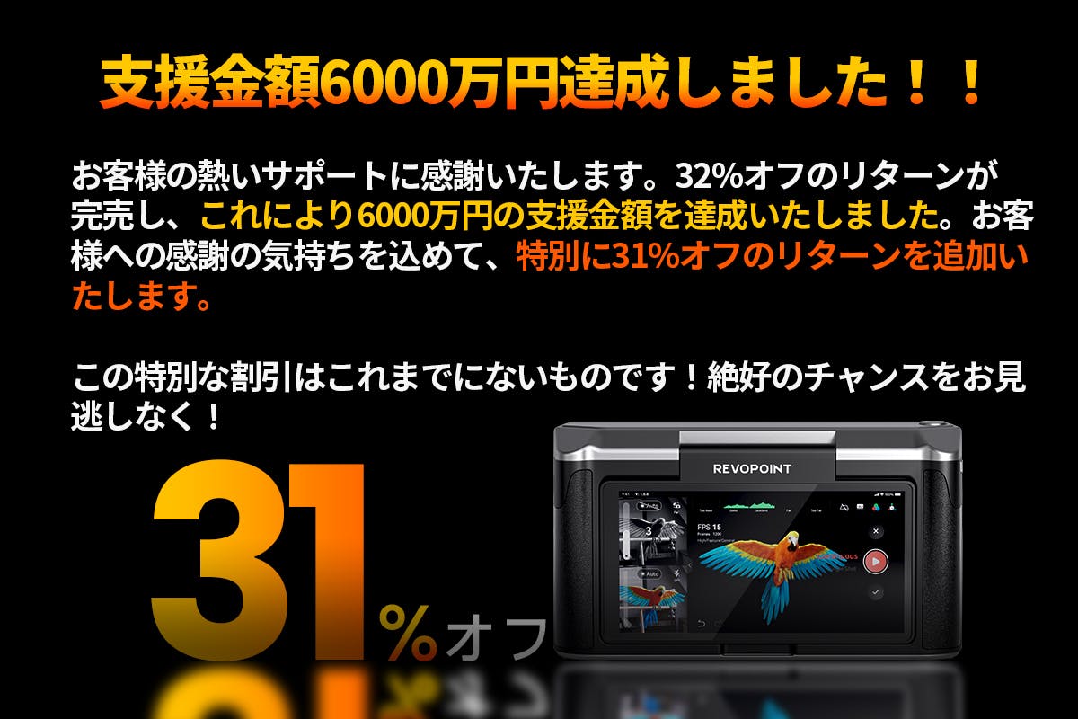 2025/08/18 18:38Revopoint をご支援いただいている皆さまへこのたびは「Trackit 光学トラッキング式3Dスキャナー」クラウドファンディングに多大なるご関心とご支援を賜り、誠にありがとうございました。皆さまのお力添えにより、本プロジェクトは総額 25,971,070円 を達成し、無事に終了することができました。現在、確定いただいたご注文につきましては、順次情報を確認し、できるだけ早く発送準備を進めてまいります。皆さまに一日も早く、Trackit がもたらす高効率かつ高精度な体験をお届けできれば幸いです。また、Trackit はすでに 日本公式オンラインストア にて販売を開始しております。クラファン期間中の購入を逃された方も、ぜひこの機会にご検討ください。Revopoint公式サイトお問い合わせご不明な点がございましたら、下記までお気軽にご連絡ください。customer@revopoint3d.com今後ともRevopointをどうぞよろしくお願い申し上げます。Revopointチーム もっと見る