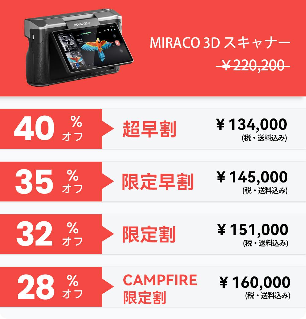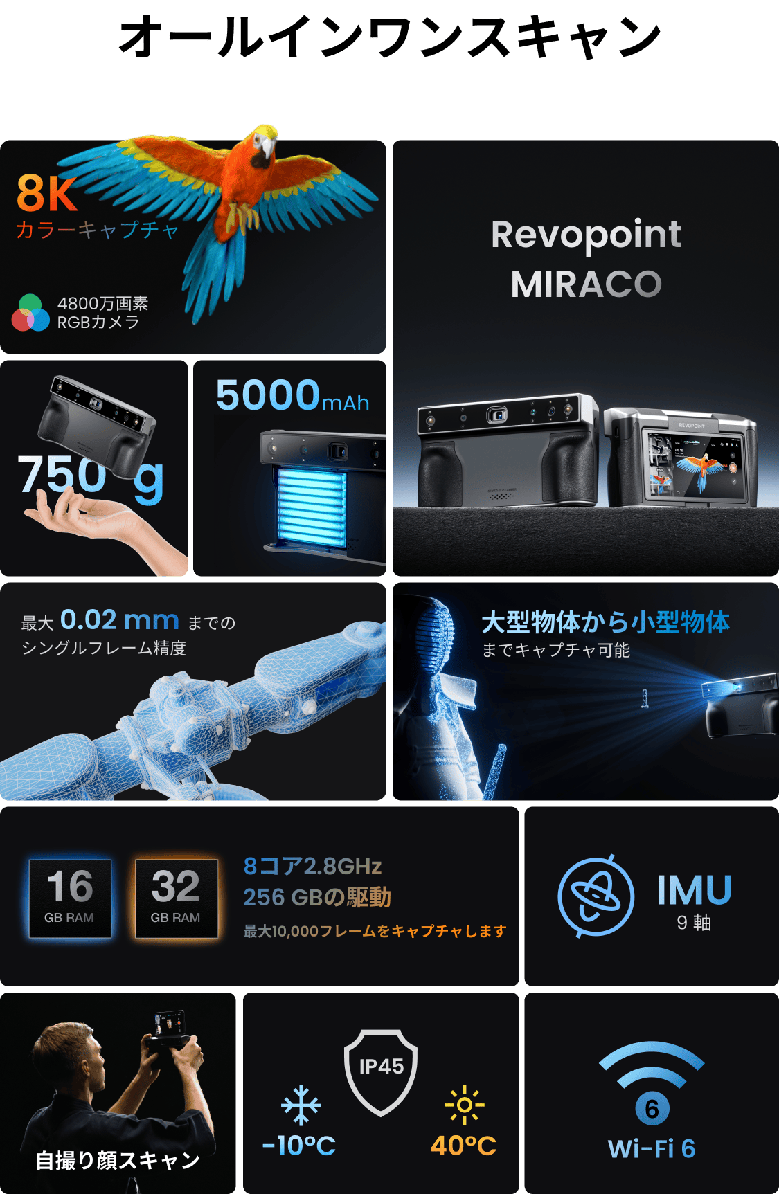 そんな方々に、軽量で独立型の3Dスキャナー、Revopoint MIRACOを自信をもってご紹介いたします。このスキャナーは、0.02mmまでの高精度、0.05mmまでの正確性を誇り、PCやスマートフォンなしで、あらゆるプロのスキャンニーズに対応できるように設計されています。小さなものから大きなものまで、そのクアッドデプスカメラシステムが対処いたします。