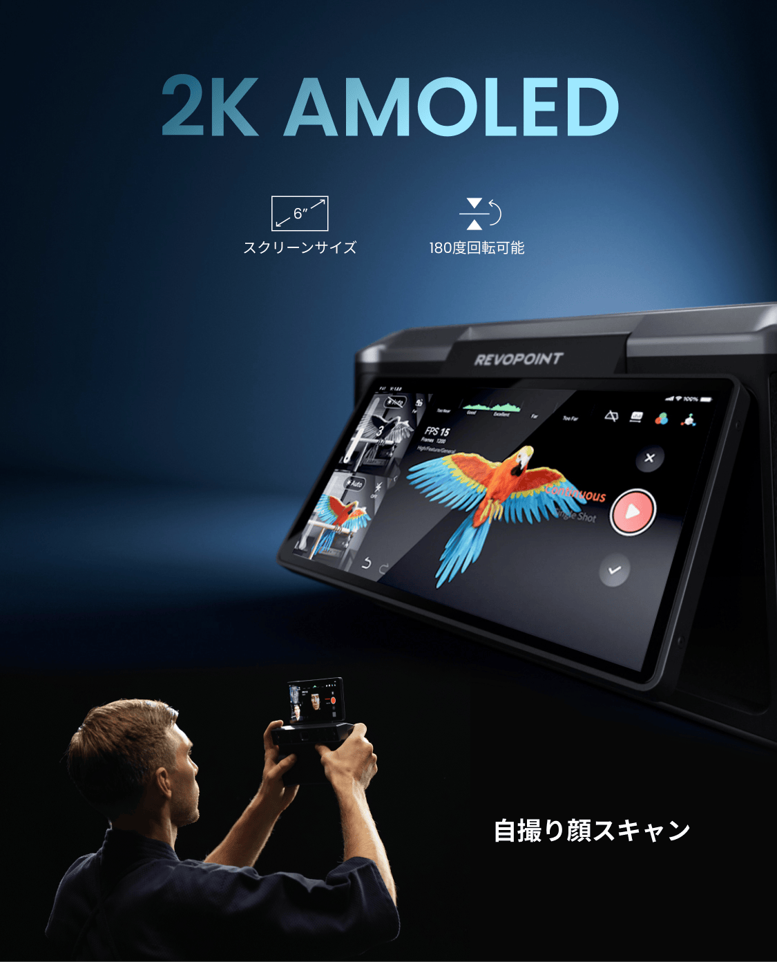 MIRACOの6インチ2KバックライトAMOLEDタッチスクリーンによって、スキャンデータが非常に鮮明に表示されます。スクリーンの角度は最大180度まで調整可能で、どの角度からも見やすくなります。さらに、自撮りスキャンのためにスクリーンを反転させることもできます。