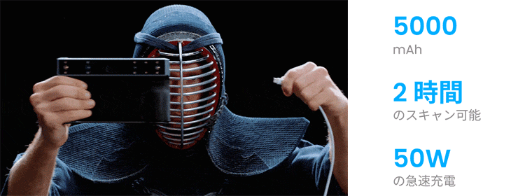 MIRACOの省エネハードウェアと5,000mAhのバッテリーにより、最大2時間のスキャンが可能です。さらに、50Wの急速充電で、わずか35分でバッテリーを80%まで充電できます。