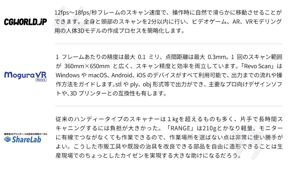 Revopointは2014年の創業以来、3Dスキャナーをより利用しやすく手頃な価格にすることで、デザイナー、メーカー、エンジニア、自動車愛好家、その他多くの人々が時間とコストを節約して3Dモデル作成をできるようにすることを目指しています。