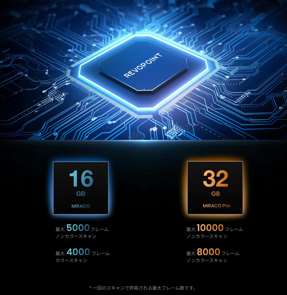9.MIRACOの16GBモデルと32GBモデルは、1回のスキャンで何枚のフレームをキャプチャできるでしょうか?