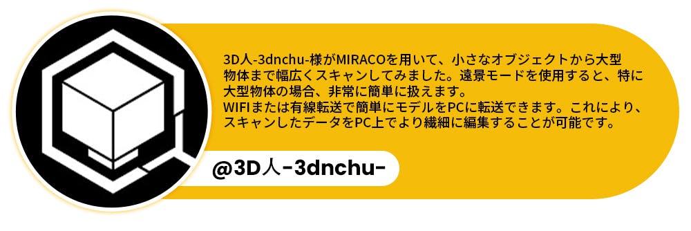 MIRACOは、高度なクワッドデプスカメラ構造化赤外線光システムを備え、どんなサイズのオブジェクトをキャプチャできます。スキャナーを切り替える必要はありません。 さらに、スキャンの途中でモードを切り替えて、複雑なディテールや形状データをキャプチャすることも可能です。