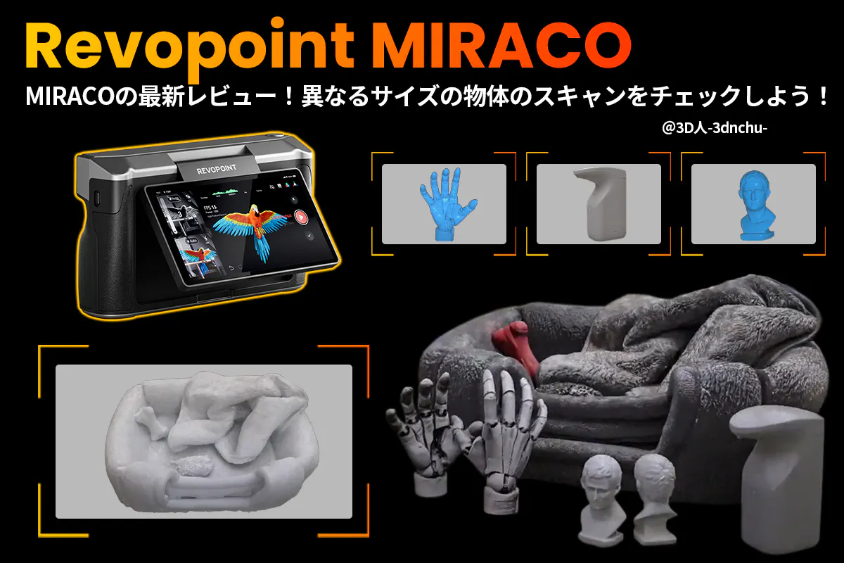 今回、新しいレビュー動画をご紹介いたします。3D人-3dnchu-様がMIRACOを用いて、小さなオブジェクトから大型物体まで幅広くスキャンしてみました。規則のソープディスペンサーも、マーカーポイント不要で順調にスキャンできました。また、手のフィギュアの関節ディテールも完璧に再現されています。