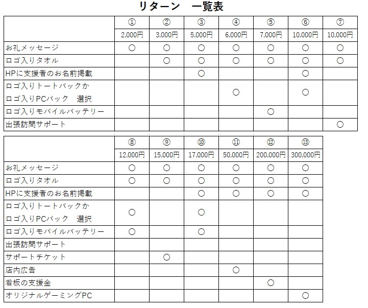 リターンに関してはロゴ入りノベルティや看板設置に必要な支援金・オリジナルゲーミングPCなど、いろいろと用意させていただきました。