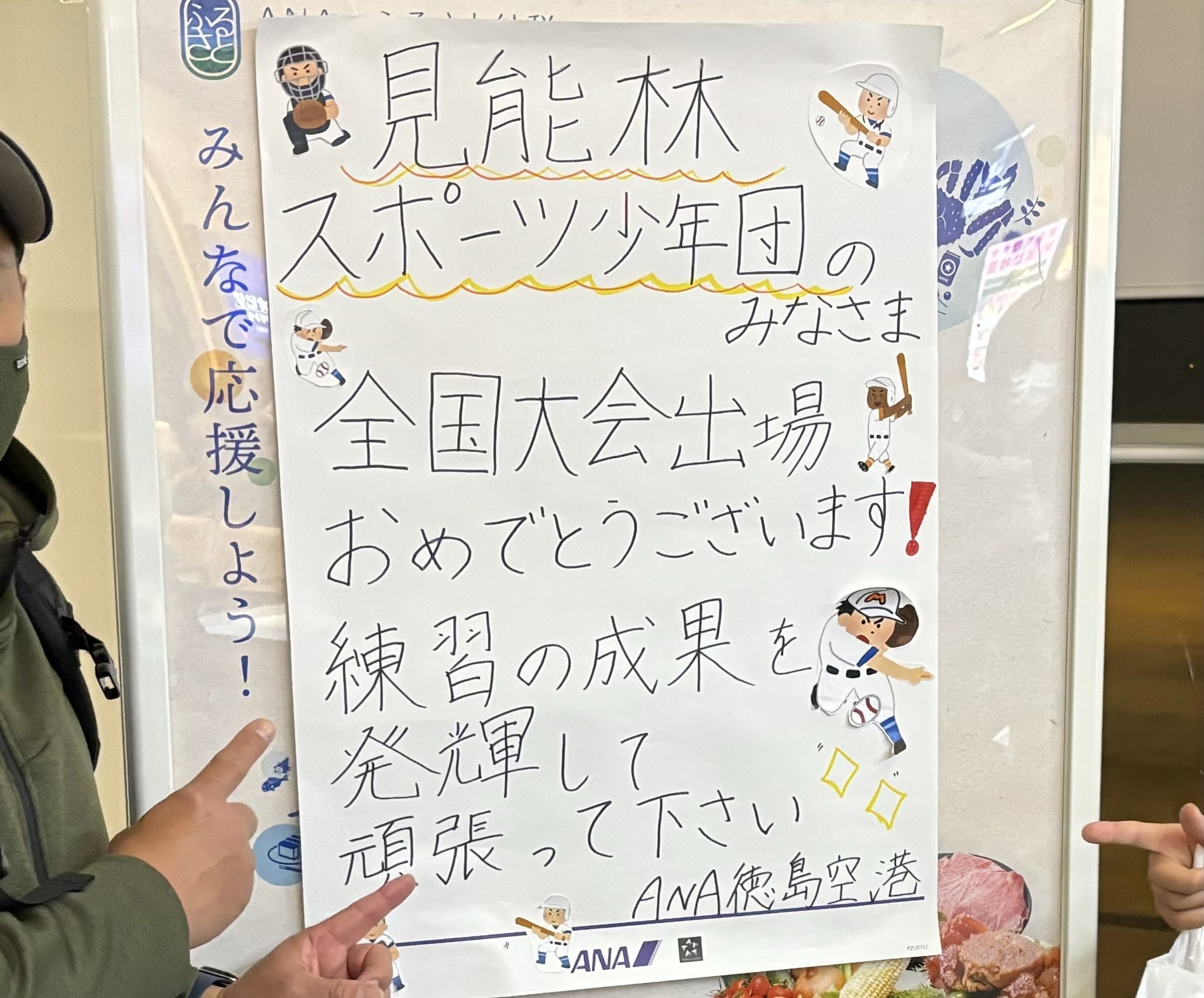 2023年12月8日(金)いざ、東京に向かって出発です!阿波おどり空港から羽田空港まで1時間15分のフライト。な、なんと。飛行機に搭乗する際、こんな貼り紙をしてくれていました‼︎全日空さんの嬉しいサプライズに感謝、感激です!子ども達も乗務員さんから「頑張ってね!」と声をかけられ、とても嬉しそうでした。全日空さんのお心遣いに、見能林スポーツ少年団一同、感謝を申し上げます。ありがとうございました!頑張ってきます‼︎