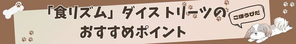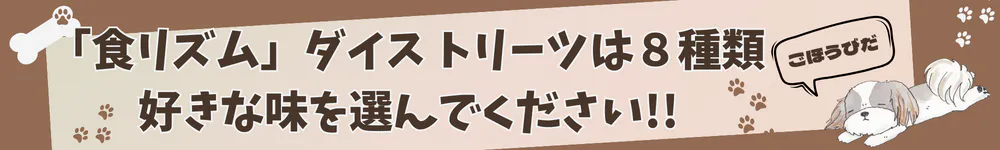 「食リズム」ダイストリーツの味は全部で8種類。「しか」「とりハーブ」「ブルーベリー」「かぼちゃ」「プレーン」「チーズ」「にんじん」「さつまいも」。中でもイチオシは「とりハーブ」です♪ ストレス軽減効果のあるハーブを使用し 本当の「おやつタイム」を提供します。