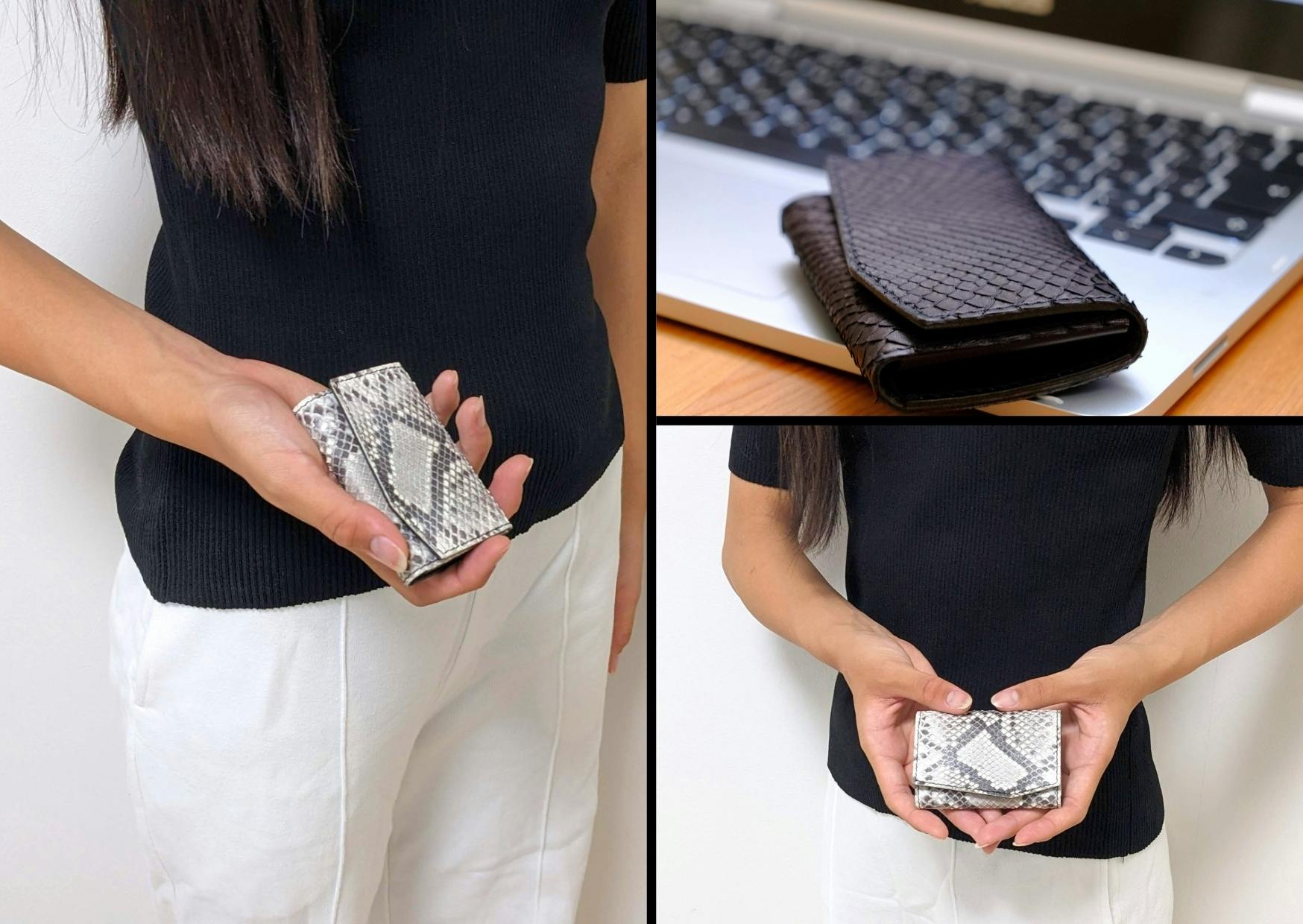 蛇革と聞くと少しワイルドなイメージがして女性からは少し敬遠しがちですが、蛇革は手触りがすごくしなやかで優しいさわり心地で、女性からもすごく人気のある素材です。