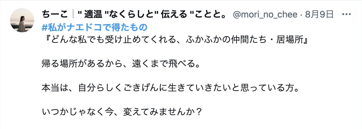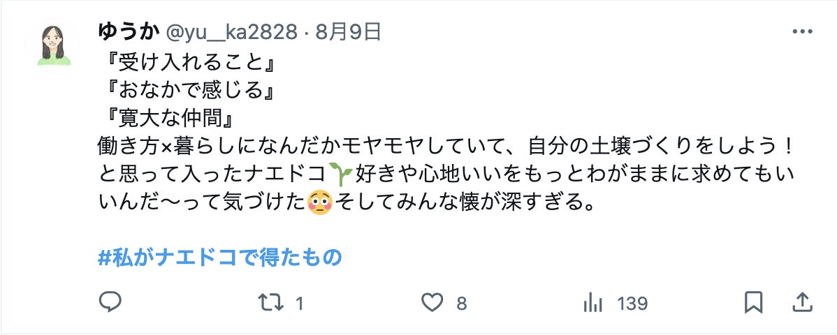 さらにたくさんの感想はXで「#ナエドコ」「#私がナエドコで得たもの」で検索してもらうと見ることができます。