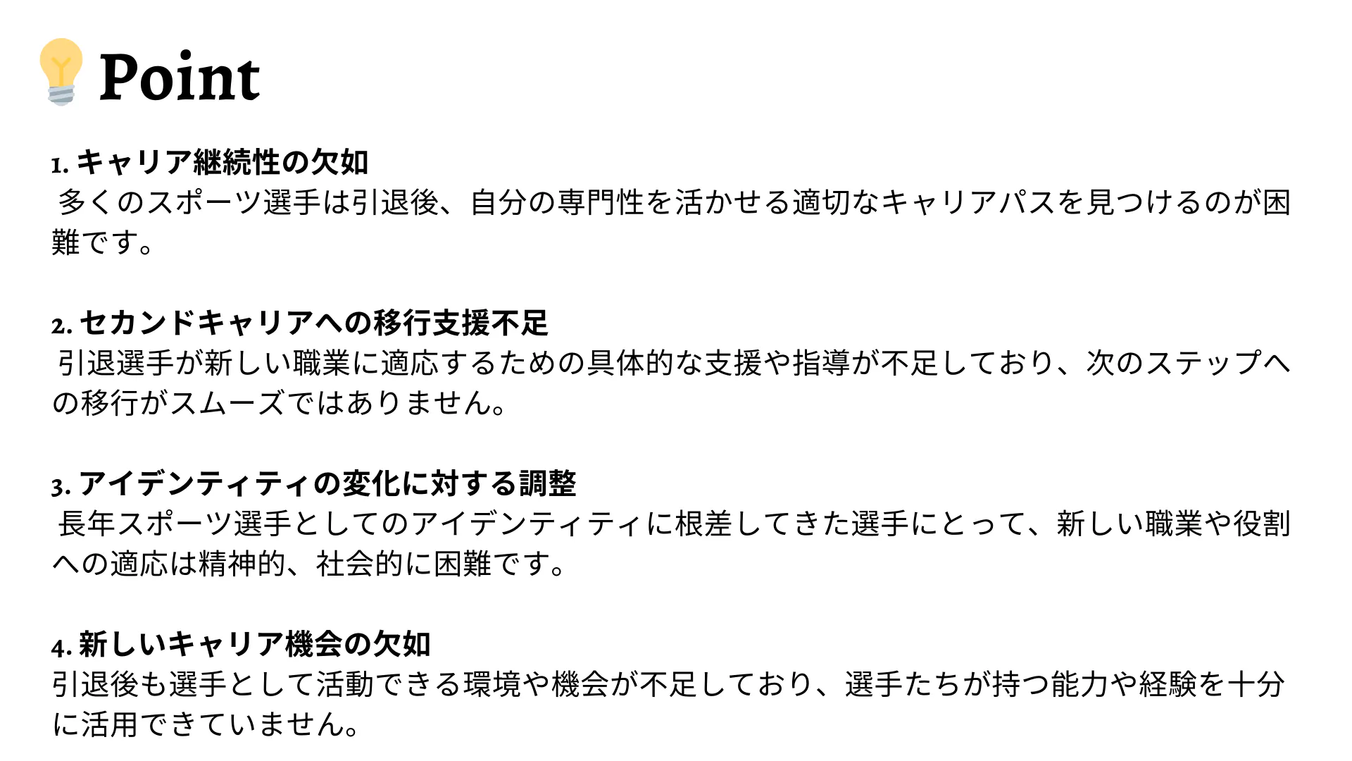 特に、長年競技に専念してきた選手は、スポーツ以外の職業への移行が難しい場合があります。