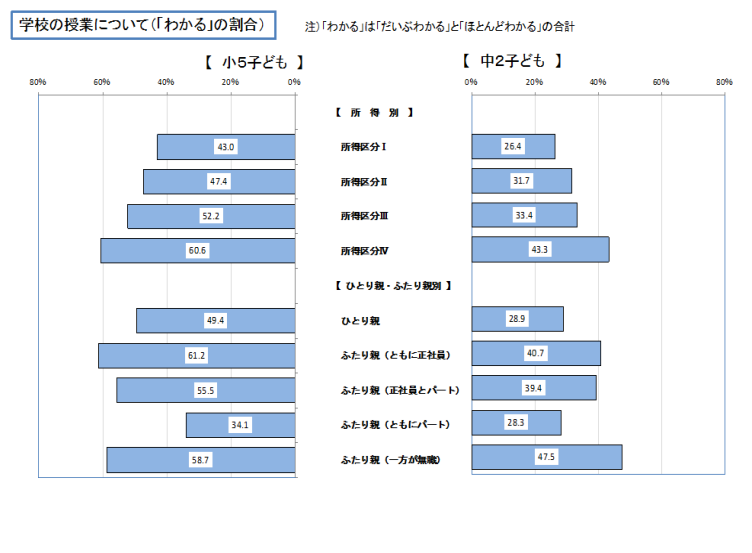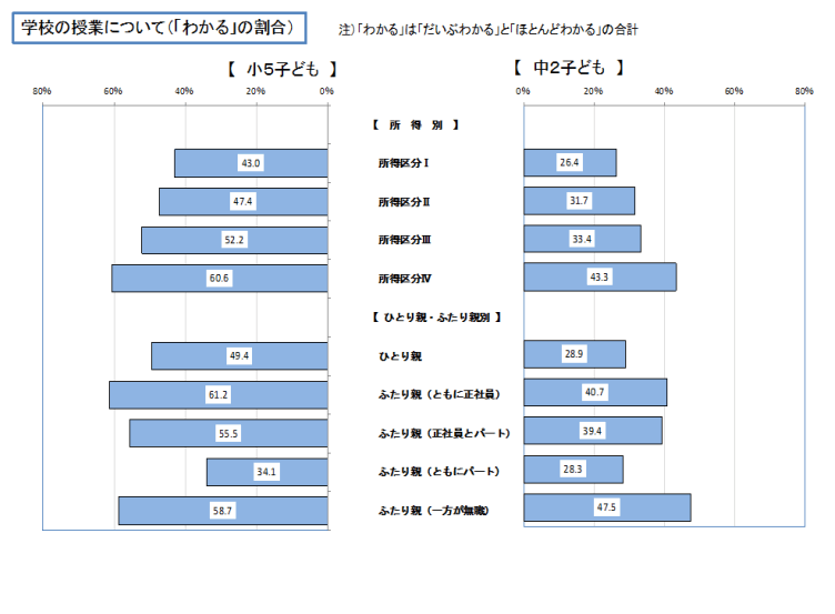 保護者の所得や学歴が高いほど、授業がわかる割合や学校で勉強することの価値を感じている子どもの割合が高くなっています。保護者の所得が低い家庭ほど、子どもの学習習熟度や大学などへ 進学を希望する割合が低くなっています。貧困の連鎖を断ち切るために学ぶことの楽しさを感じてもらうことが学ぶことへの意欲の足がかりになると考えています。