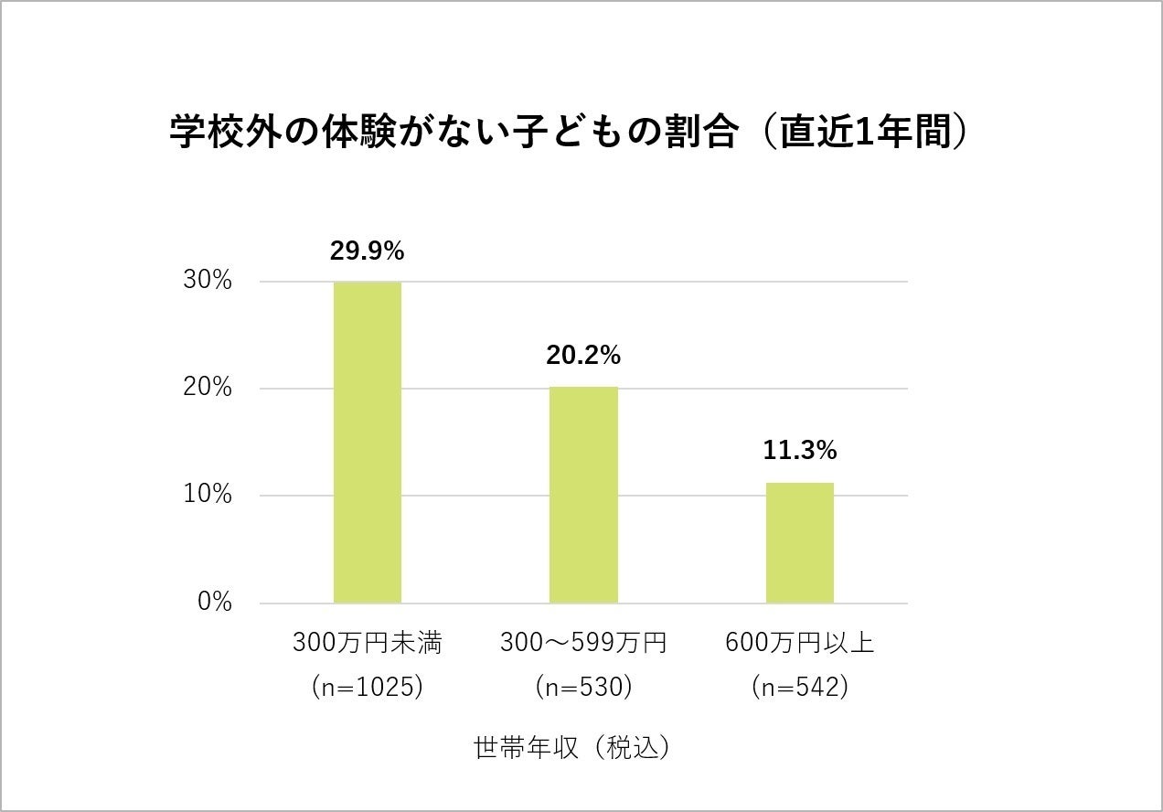 公益社団法人チャンス・フォー・チルドレンが小学校1~6年生の子どもがいる家庭を対象に行った調査によると、世帯年収300万円未満の家庭の子どもの約3人に1人が、 1年を通じて「学校外の体験活動を何もしていない」という。これは同じく小学生を持つ世帯年収600万円以上の世帯の同回答と比べて約2.6倍の数字になります。