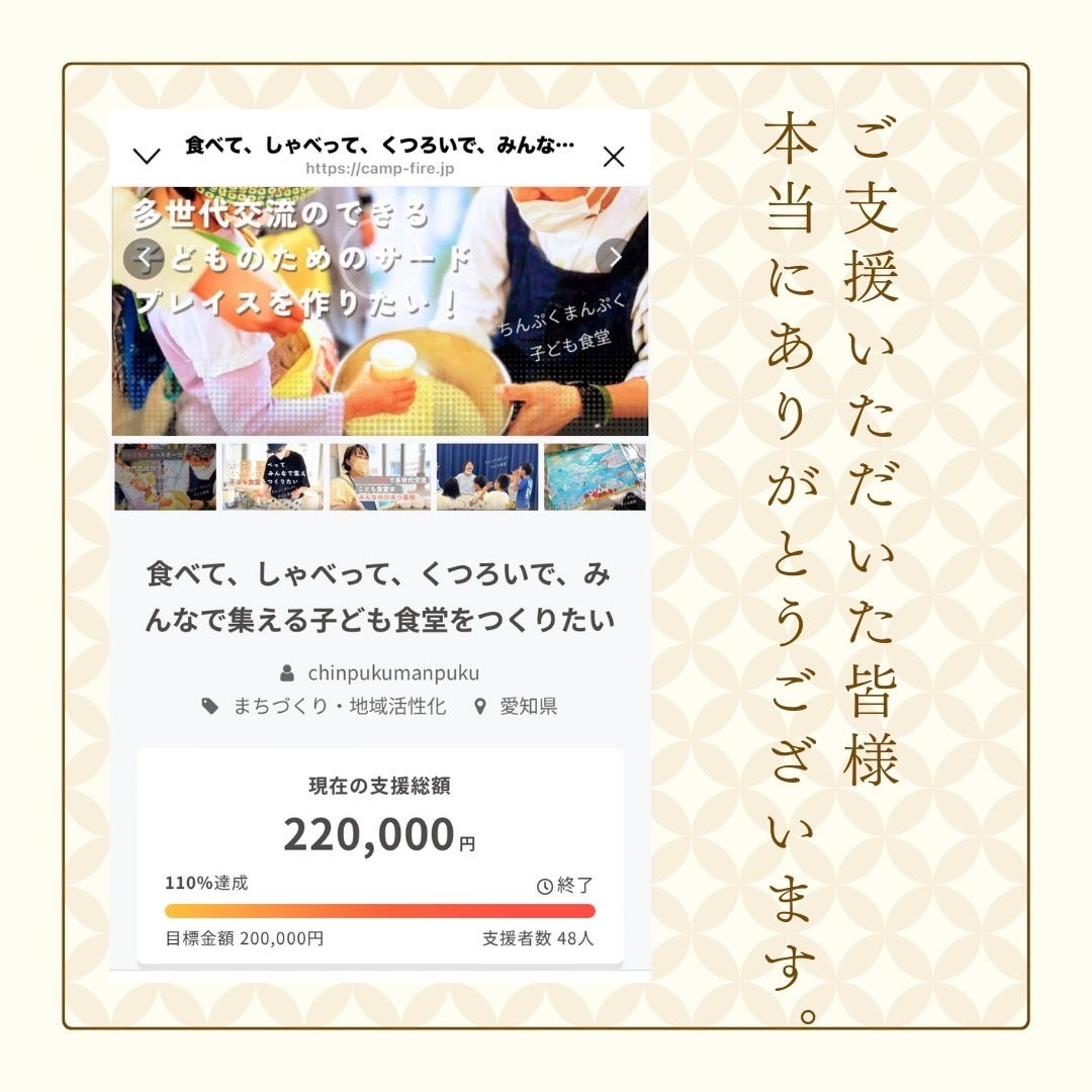 2024/03/19 11:452024年3月15日㈮みなさまのご支援のおかげで無事に子ども食堂開設のためのクラウドファンディングを達成率110%で終了することができました。ご支援いただきました皆様本当にありがとうございました。皆様からいただいたご支援金を大切に使わせていただきます。またご報告させていただきます。お近くにお越しいただいた際はぜひお立ち寄りください。愛知県知多市第3日曜日 9:30-体験活動 12:00-食事詳細はホームページに記載がございます。又は直接メッセージいただけますと、こちらから個別でご連絡いたします。今後とも何とぞよろしくお願い致します。NPO法人子どもの気力・体力・知力向上委員会ChikiChiki隊ちんぷくまんぷく子ども食堂 代表 前田 聖子 もっと見る