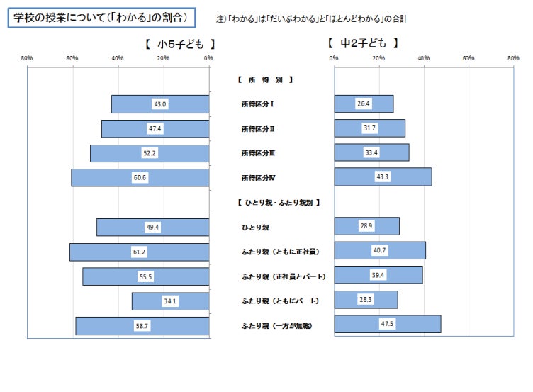 保護者の所得や学歴が高いほど、授業がわかる割合や学校で勉強することの価値を感じている子どもの割合が高くなっています。保護者の所得が低い家庭ほど、子どもの学習習熟度や大学などへ 進学を希望する割合が低くなっています。貧困の連鎖を断ち切るために学ぶことの楽しさを感じてもらうことが学ぶことへの意欲の足がかりになると考えています。