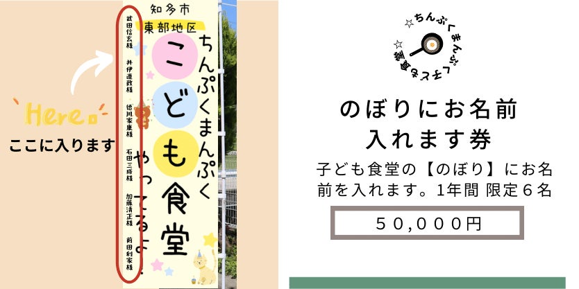子ども食堂で提供するメインの食事に好きなお名前が付けられます。12食限定です。