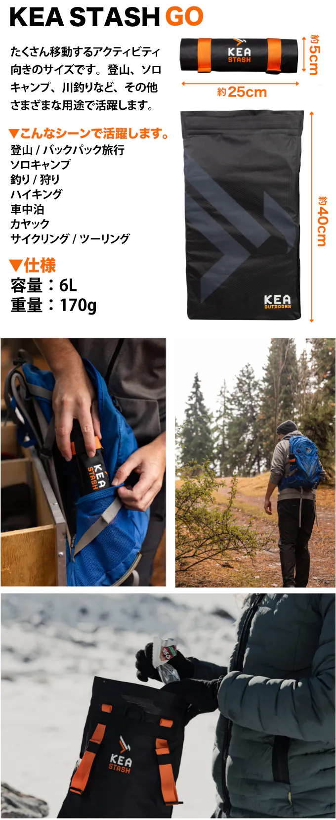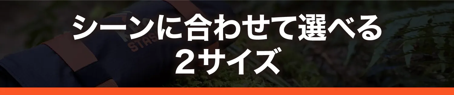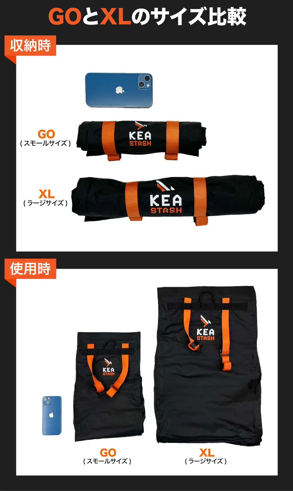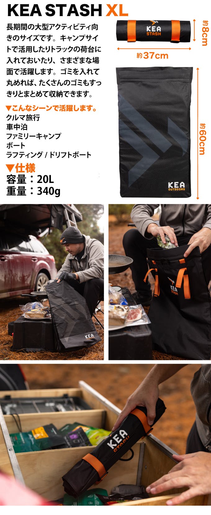 KEA STASHのサイズは、GOとXLの2種類を用意しました。あらゆるアウトドアアクティビティで使えます。異なるのはサイズだけで、機能などその他はすべて一緒です。