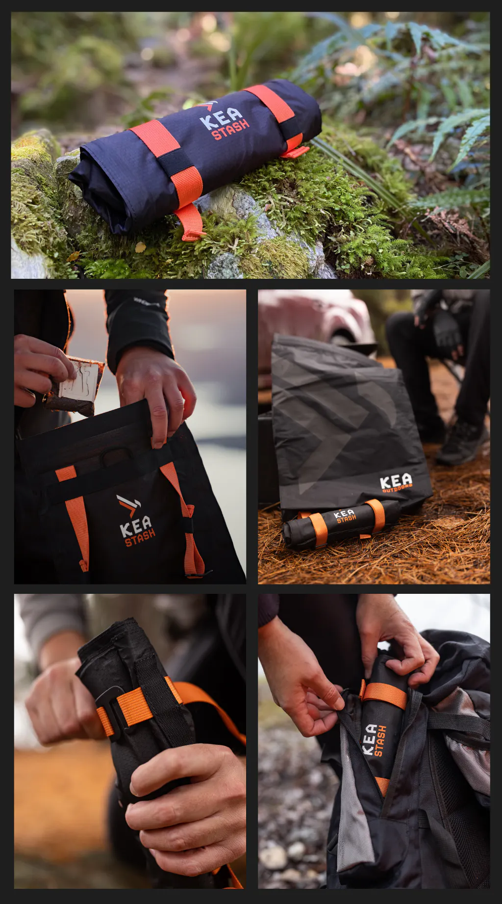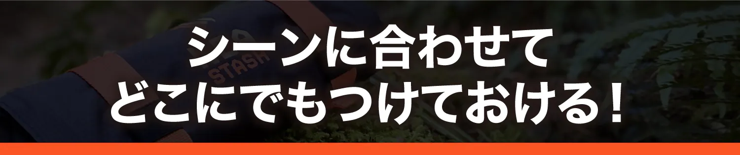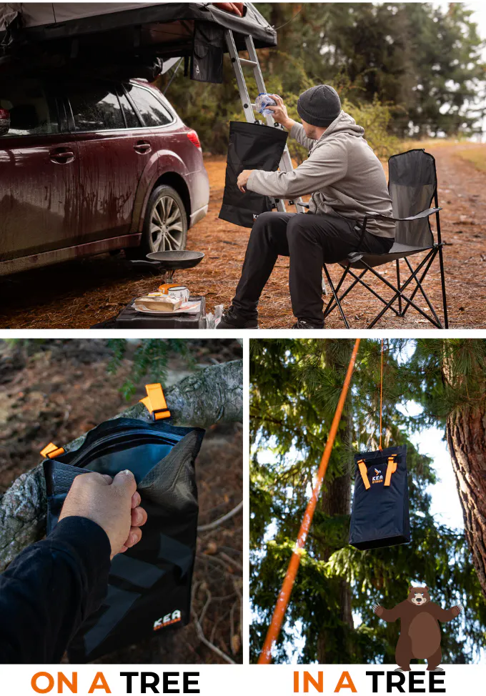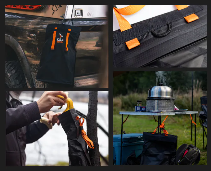 移動中もキャンプ中もどちらにも使えます。KEA STASHには超軽量アルミ製フック、長さ調整可能ストラップ、ロープループがあるので、バックパック、木の上、その他さまざまな場所にかけておくことができます。
