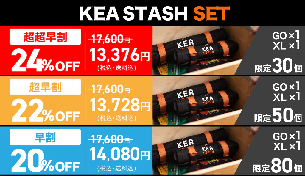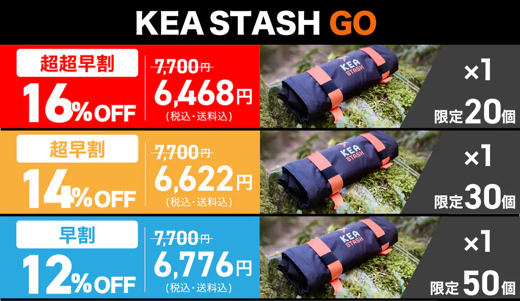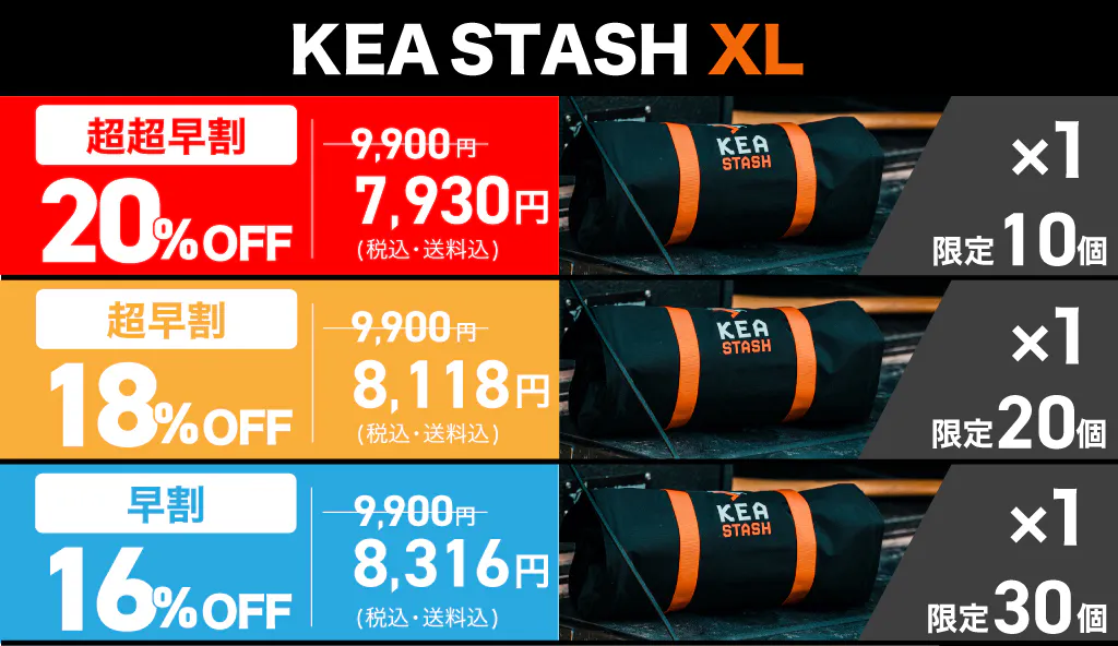 A.KEA STASH GOが約170g、KEA STASH XLが役340gとなっており軽量設計になっております。