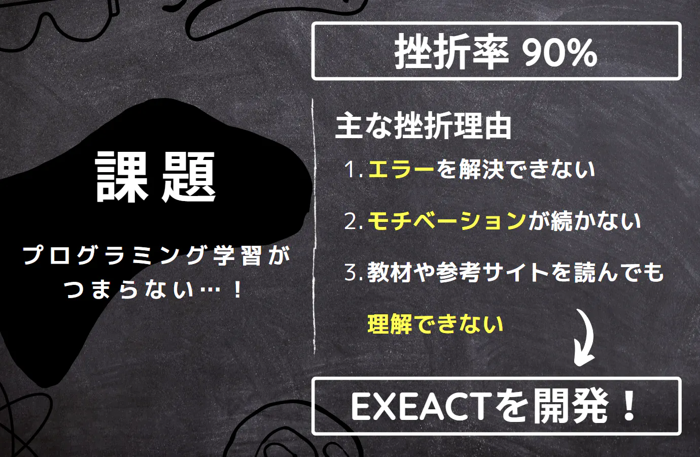 現在、プログラミング学習の挫折率が90%ととても高いことが大きな課題となっています。また、多くの学習者は以下理由で挫折しています。