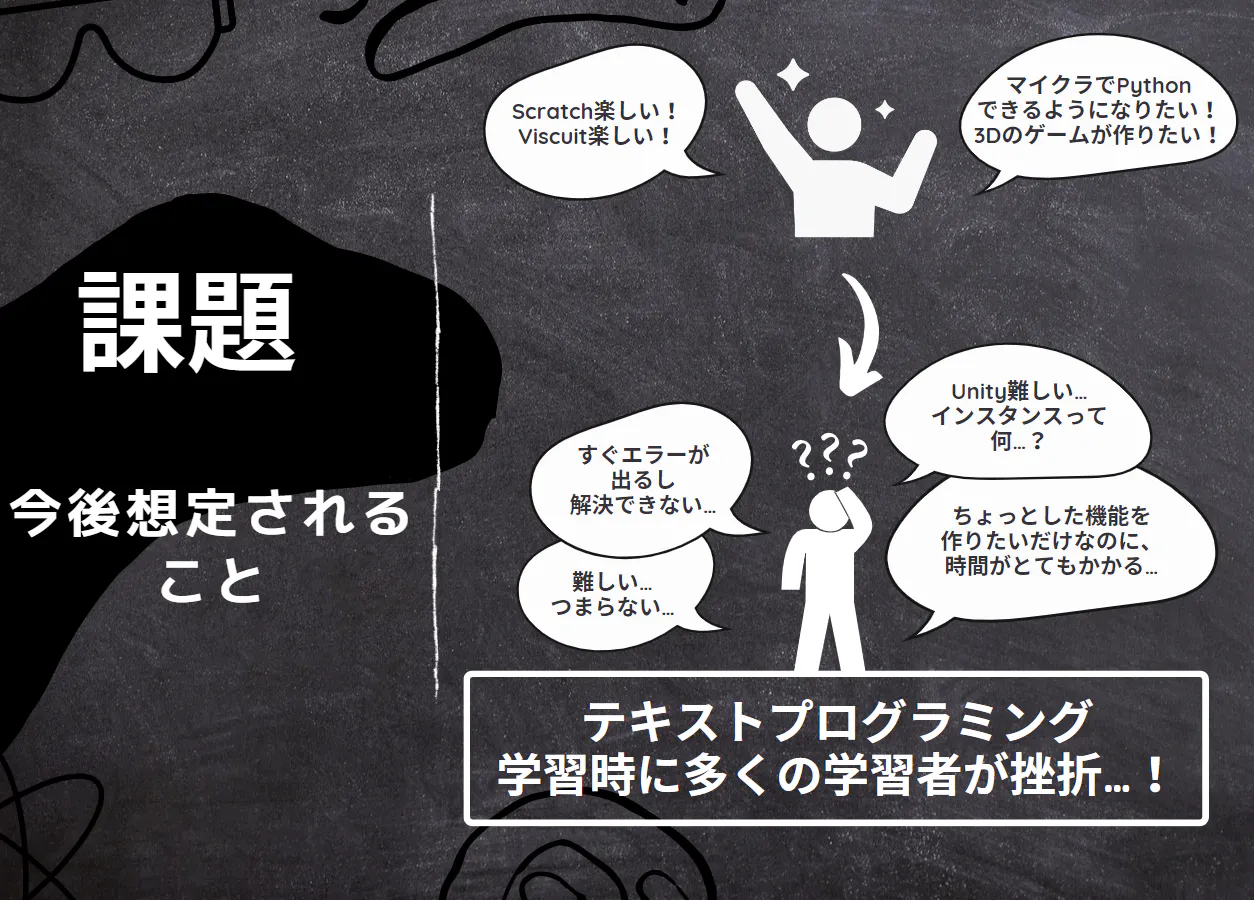 そして、現在は小学校からプログラミング学習が義務教育となっていますが、だからこそ、つらいプログラミング学習に触れて、嫌いになってしまったり抵抗を感じてしまう子どもが今後増えていくと懸念しています…