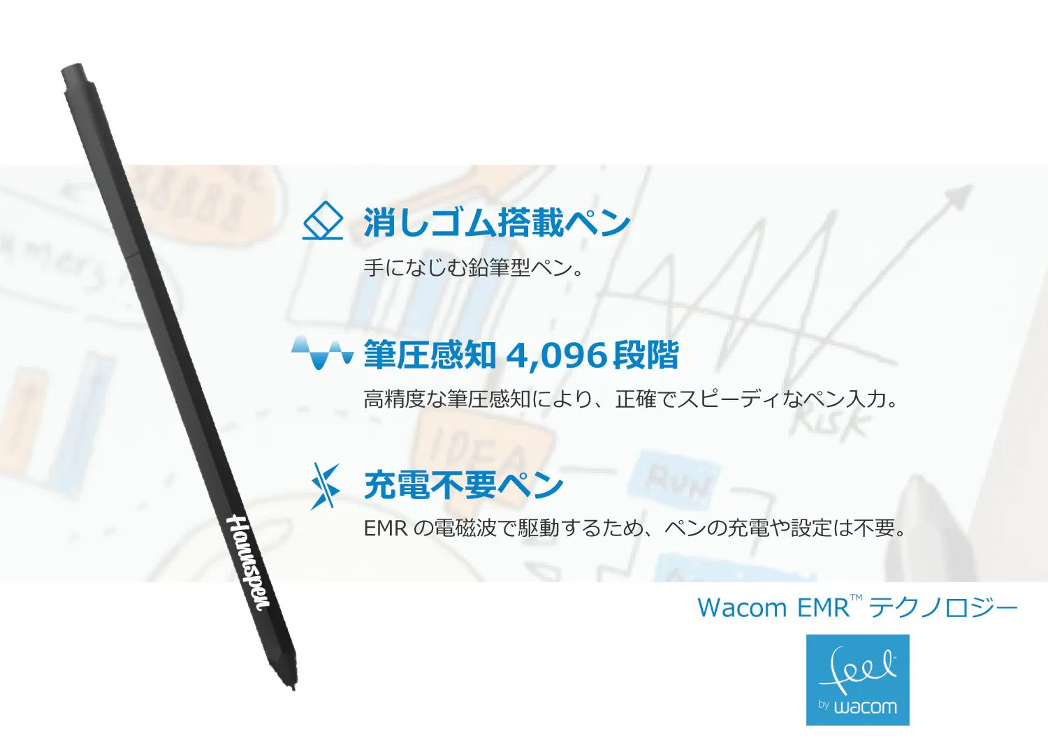 Wacomが特許を取得した電磁誘導方式(EMR)を、ペンだけでなくディスプレイにも搭載されています。