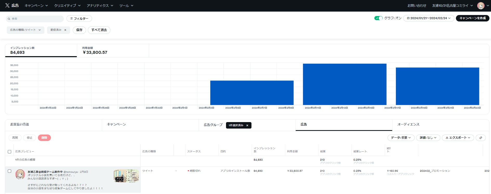 プロモツイート開始しました!まずはテストで5000円から