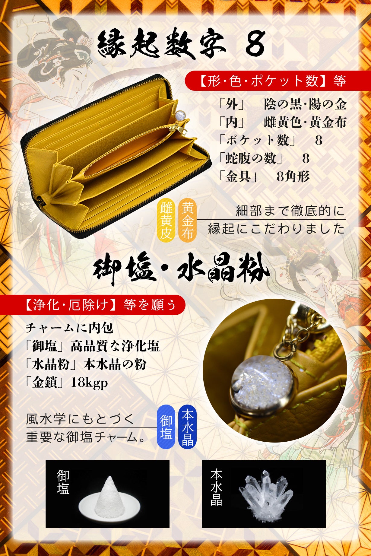 10名の風水師が考え抜いた、内側が「8・黄色・金・塩・水晶」のお財布は強力なパワースポット!