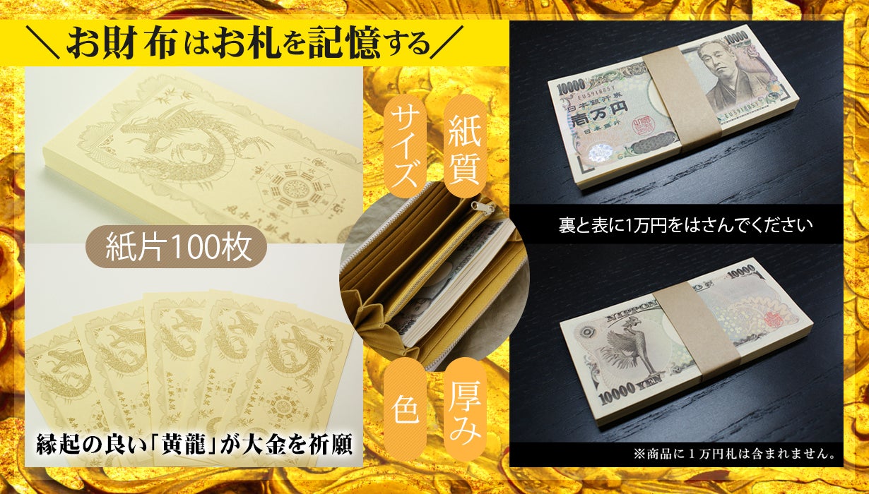 仲間を増やして、お財布にお金を記憶する。1万円札と全く同じサイズの紙を入れる事で運気を上げるとされているお札の元。