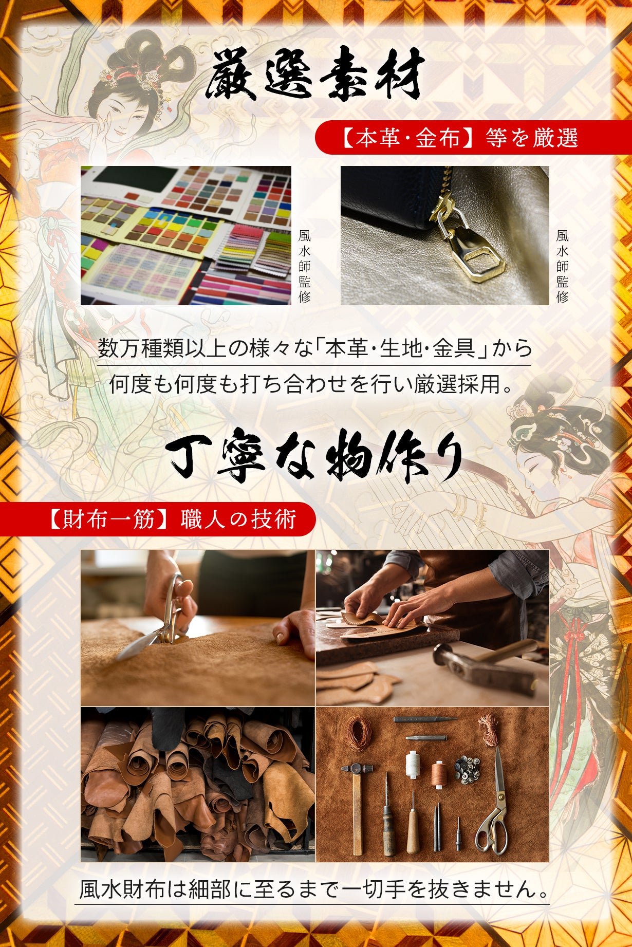 A: 大変申し訳ございませんがお教えできません。当初1名の先生を選定してお名前を出すことも考えましたが、より良い物を作りたいため風水のセカンドオピニオンとして先生数名の意見をまとめております。そのため完全に1人の意見で製造したお財布ではないため恐れ入りますが伏せさせて頂いております。