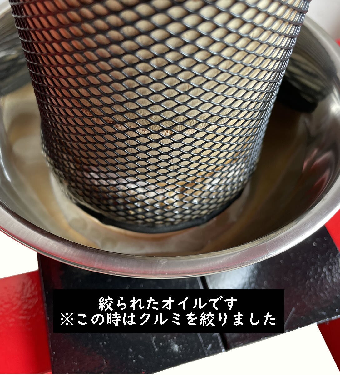 こうして絞られた植物油を舐めてみると市販品にはない美味しさに感動。