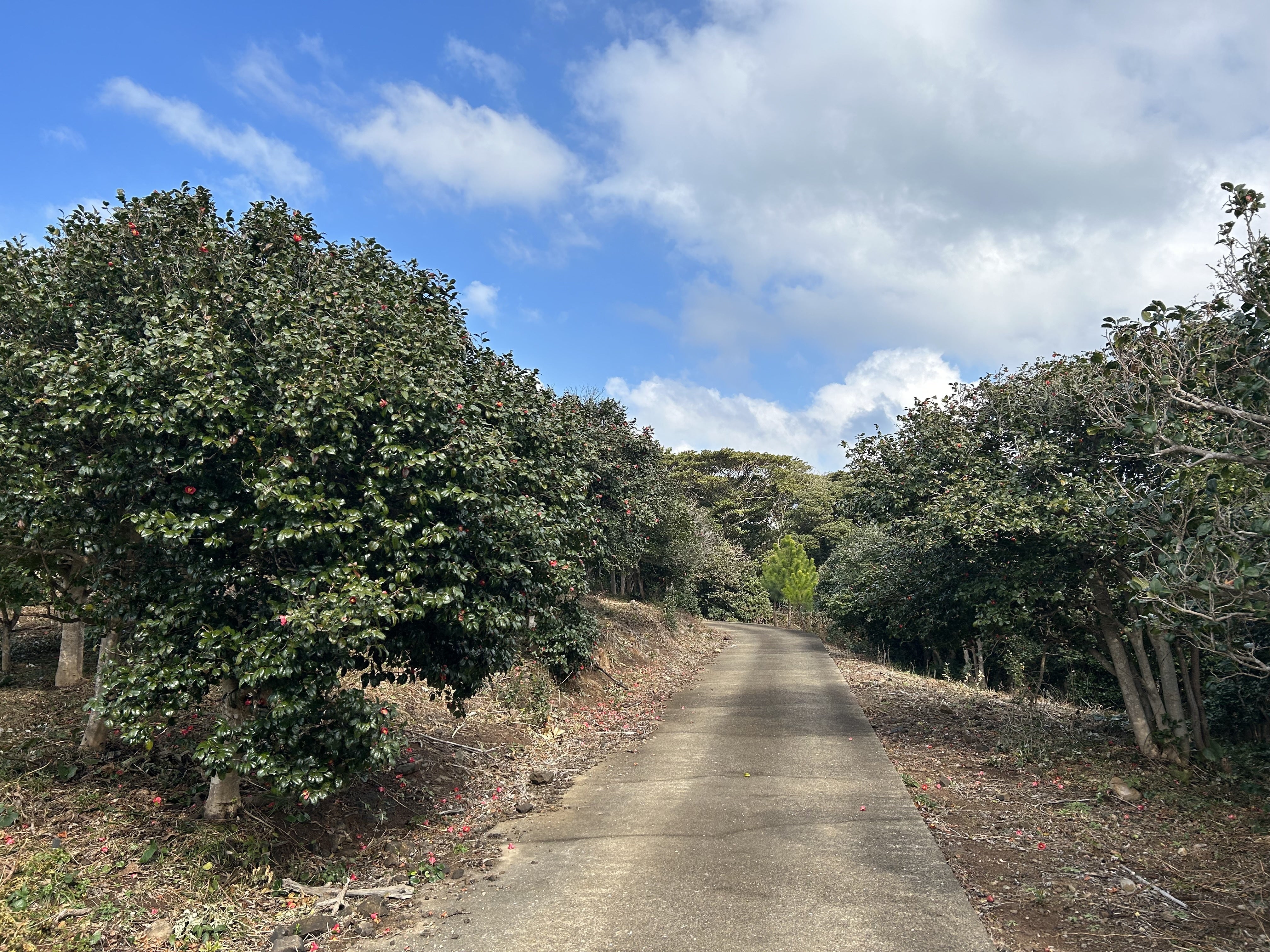 画像は加唐島の島北部にある道で、両サイドには椿の木が立ち並びます。
