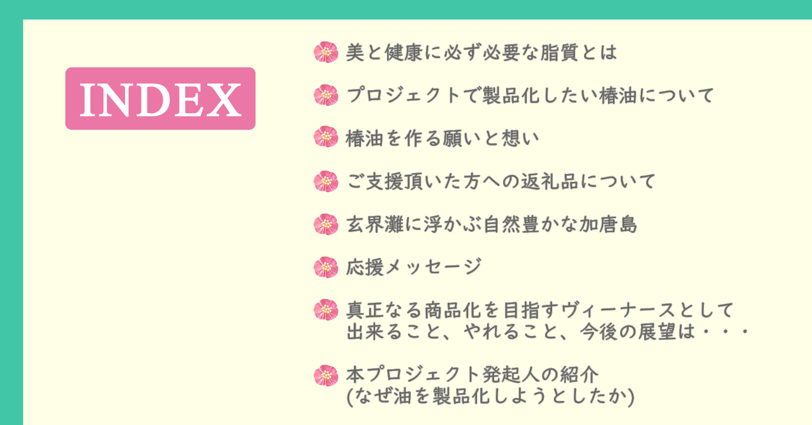 第一弾として佐賀県の離島、加唐島で採油された「椿油」を100%使用した美容オイルを製品化したくクラウドファンディングに挑戦します。