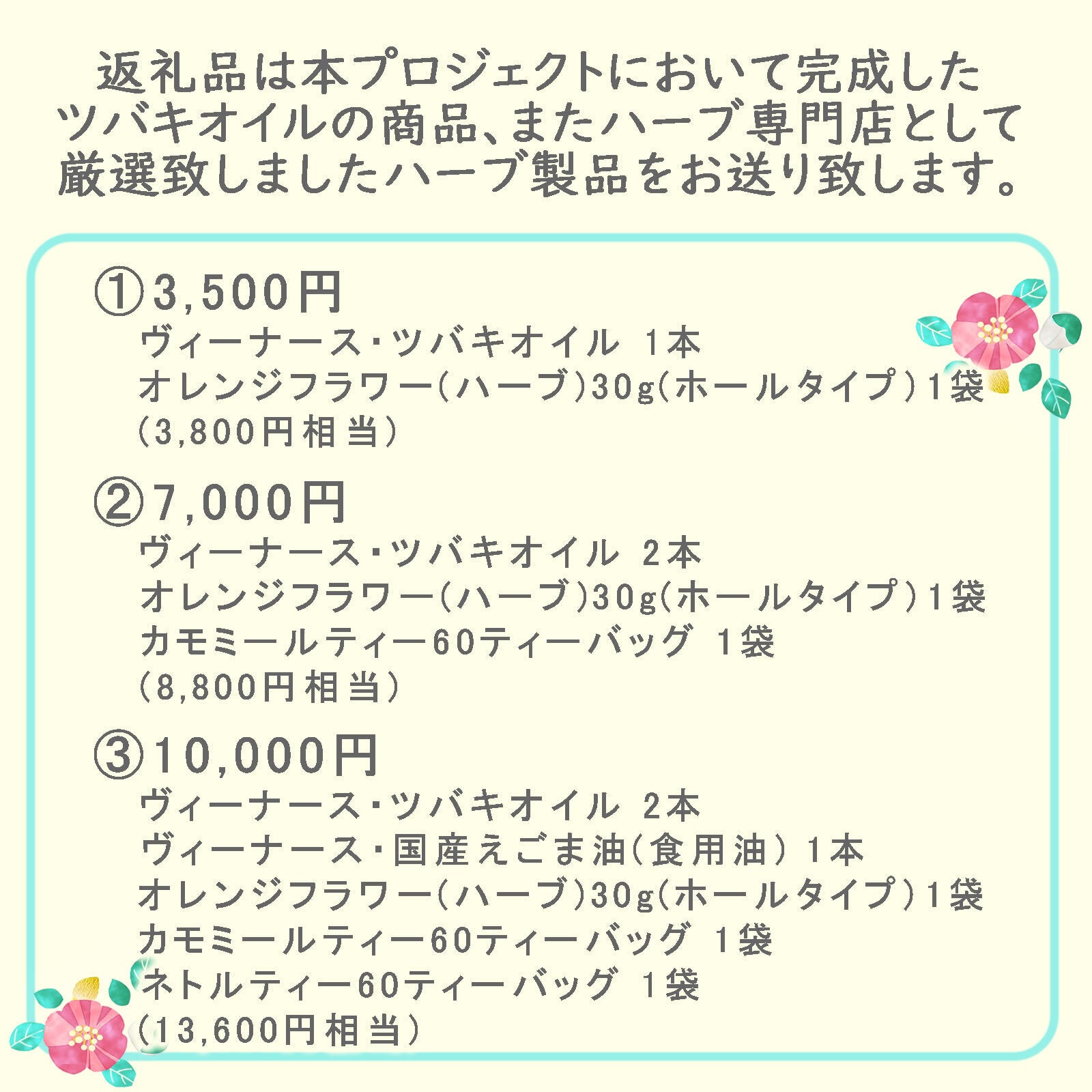 本プロジェクトのツバキオイルを返礼品としてお付けいたします。