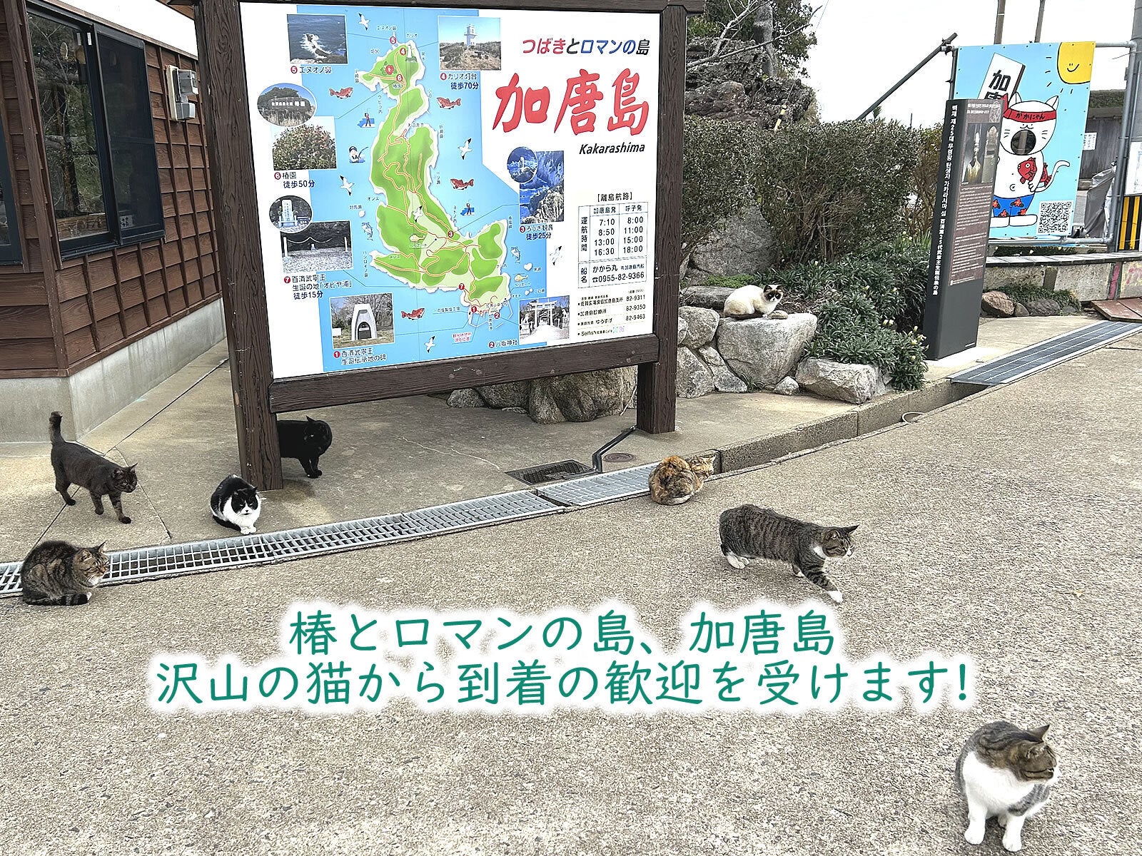 加唐島の主な特徴をあげるとすると3つあり、①猫の島、②百済の25代国王である武寧王(ぶねいおう)が生まれた地、③島中央部から北に広がる「ヤブツバキ」の群生地です。