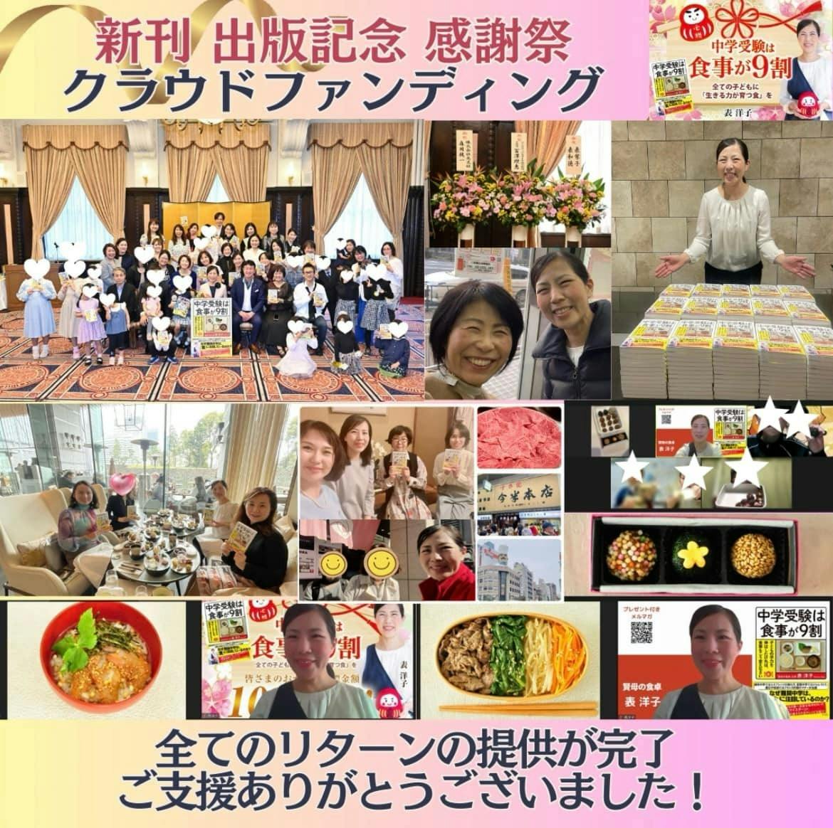 2024/04/17 20:46この度は、3月21日発売の表洋子の新刊 『中学受験は食事が9割』(光文社)出版記念クラウドファンディングのご支援、応援をいただきまして誠にありがとうございました。皆さまのおかげで目標金額150万円を【100%達成】した人生初挑戦のクラウドファンディング。約1ヶ月かけて無事に全てのリターンの提供が完了しましたことをご報告申し上げます。書籍の発送作業からスタートし、オンライン料理教室、日本橋&かっぱ橋ツアー、アフタヌーンティー茶話会、そして、出版記念パーティー。お忙しい中、ご都合をつけて全国各地からご参加くださいましたこと、心より感謝申し上げます。「どのリターンも魅力的で全てのイベントに参加したいほどでした」クラファンが終わってからもSNSシェア、メッセージなど連日にわたり、私の新刊の出版を応援しくださる方がこんなにもたくさんいらっしゃることに感謝感激の1ヶ月でした。さらに、大変ありがたいことに新刊の出版をきっかけに、◎大企業様のメニュー監修◎テレビ局系列のカルチャー講座◎行政の料理講座すでに各所からオファーをいただいております。本書でお伝えしている「生きる力が育つ食」を効果的に使うことで、未来を担う子どもたちが自分らしく生き生きと活躍できることを願って。より多くの必要な方へ賢母の食卓をお届けできるよう、今後、活動の場を広げていく所存です。引き続き、どうぞよろしくお願い申し上げます。賢母の食卓主宰表洋子 もっと見る