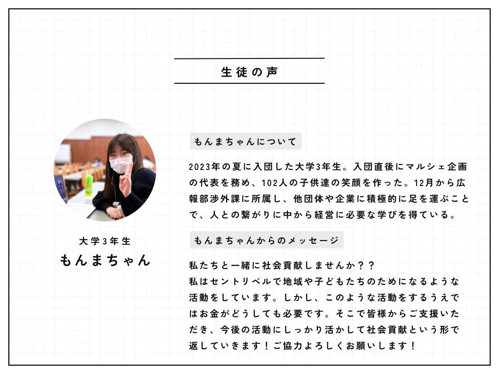 学生団体Sentliberでは、「学生が自らの好奇心から生まれた想いを共創することで自己実現と社会貢献を行う」を理念に活動しています!2022年1月に設立され、Sentliberには中学生から大学生までの生徒が所属しています。また、学生の精神面・知識面・経済面を支える大学生以上のカウンセラー、メンタルトレーナー、アドバイザー、アンバサダーが所属しています。生徒たちは理念にもある「想い」を実現し、自分の居場所を見つけています。主に埼玉で活動を展開していますが、所属者は地方や離島、海外など場所に制限を付けずのびのびと活動しています!私たちの団体は、様々な社会課題に目を向けプロジェクトを4か月かけて準備しています。今回はその運営メンバーである3期生が準備してきた「マルシェでの託児所出店」を行うため、クラウドファンディングを実施します。
