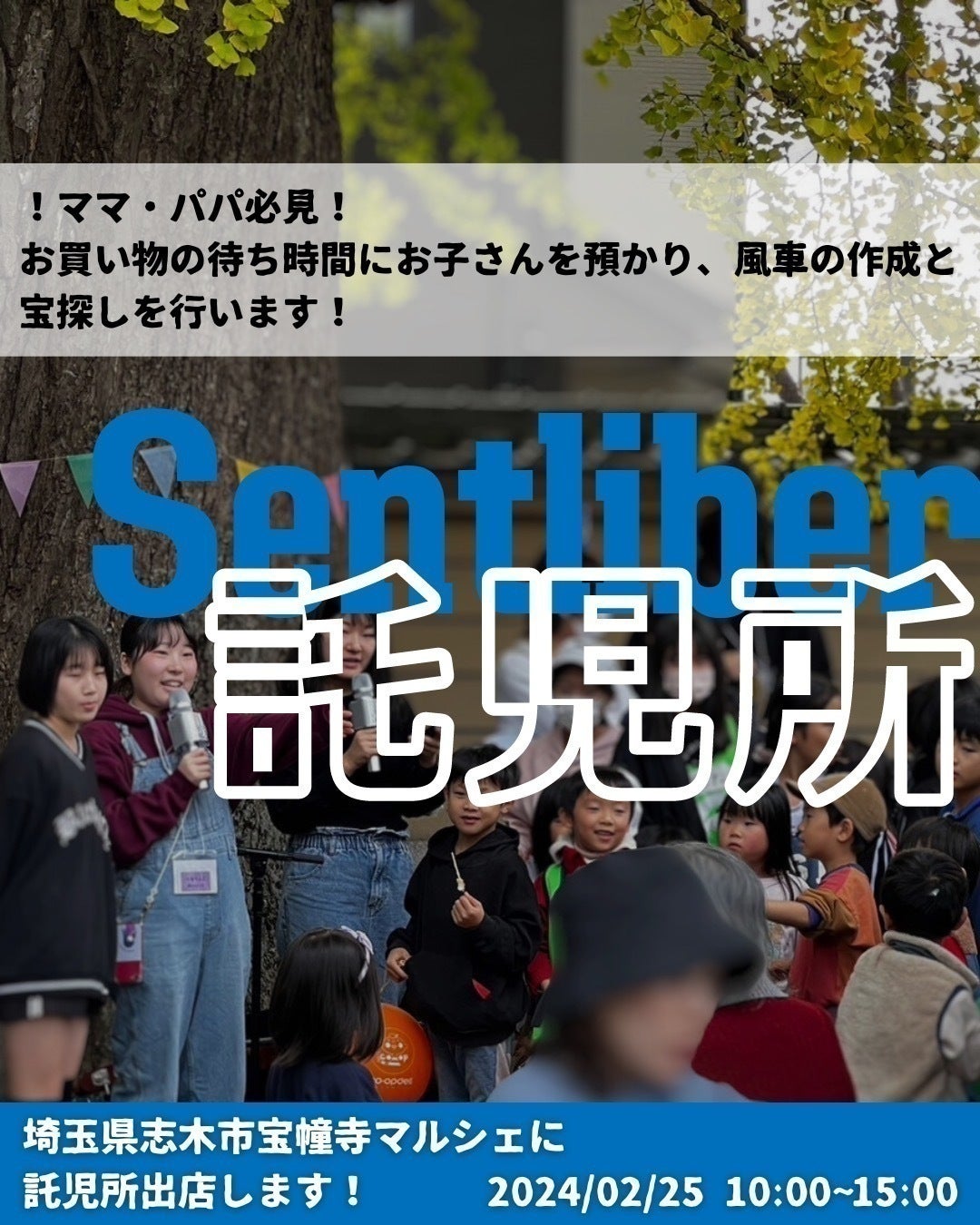 今回、私たちは埼玉県志木市宝幢寺で開催される「宝幢寺マルシェ」に託児所を出店します!私たちは今回で4回目の出店になります。マルシェには普段街で活動している教育系の団体やキッチンカーなどがきて食べ物や雑貨などを販売しています。毎年、マルシェ自体への来場者も増えており、店舗はいつも行列です。小さな子供は列に並ぶのが疲れてしまったり、じっとしていられないことがあります。そのため、私たちはお母さん・お父さんが安心してお買い物をすることができるように、小学生以下の子どもたちを預かる託児所を出店します。また、その間に子供達には風車作りや宝探しをしてもらい、体験格差にも貢献していく予定です。