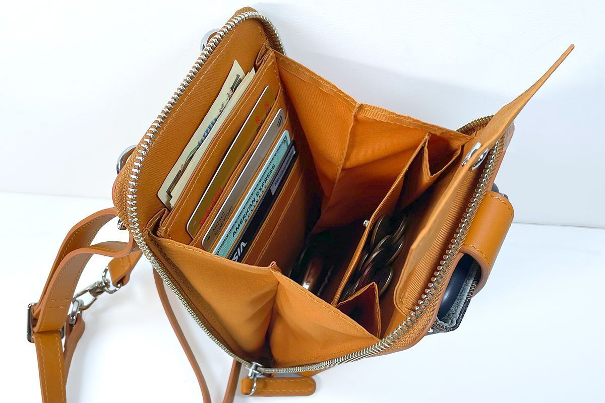 カード、紙幣、コイン、キー、パスポートなど全ての物が一度に取り出しやく見やすい構造にし、背面には交通カードポケット、マスク、カードなど入れられるZIP付ポケットを取り付けました。