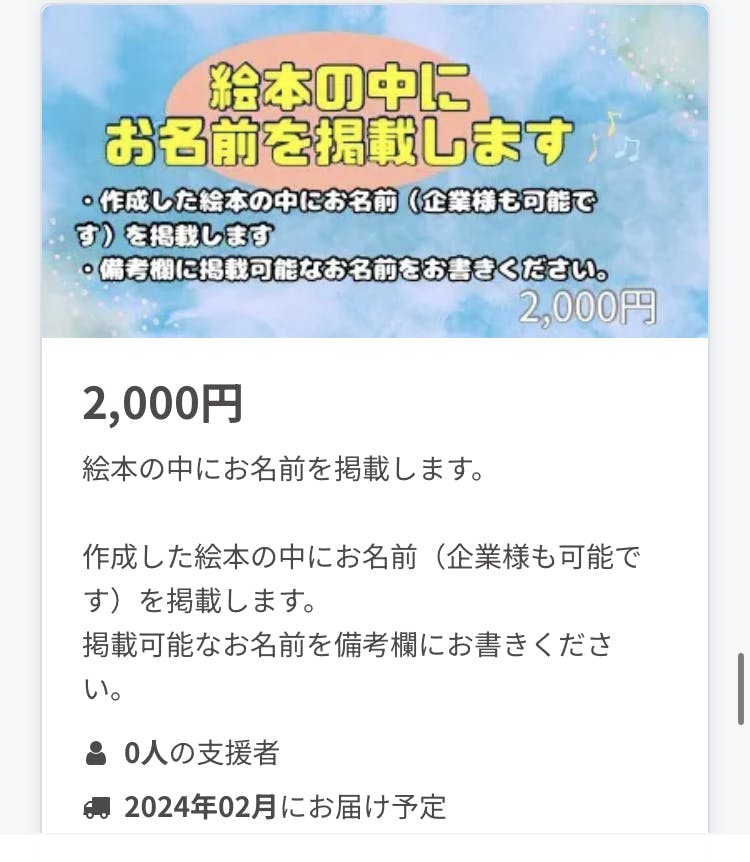 絵本の最後のページにお名前(企業様も可能です)を掲載させて頂くというものです!