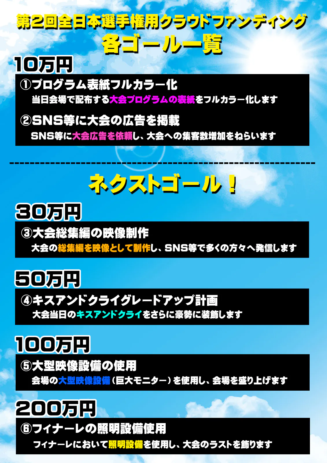 2024年2月24日には第2回大会を大阪にて開催することが決定しておりますが、大会をさらに充実させ、コーチ・選手だけではなく全ての関係者の皆様の記憶に残るような大会にしようとクラウドファンディングの実施を決定致しました。