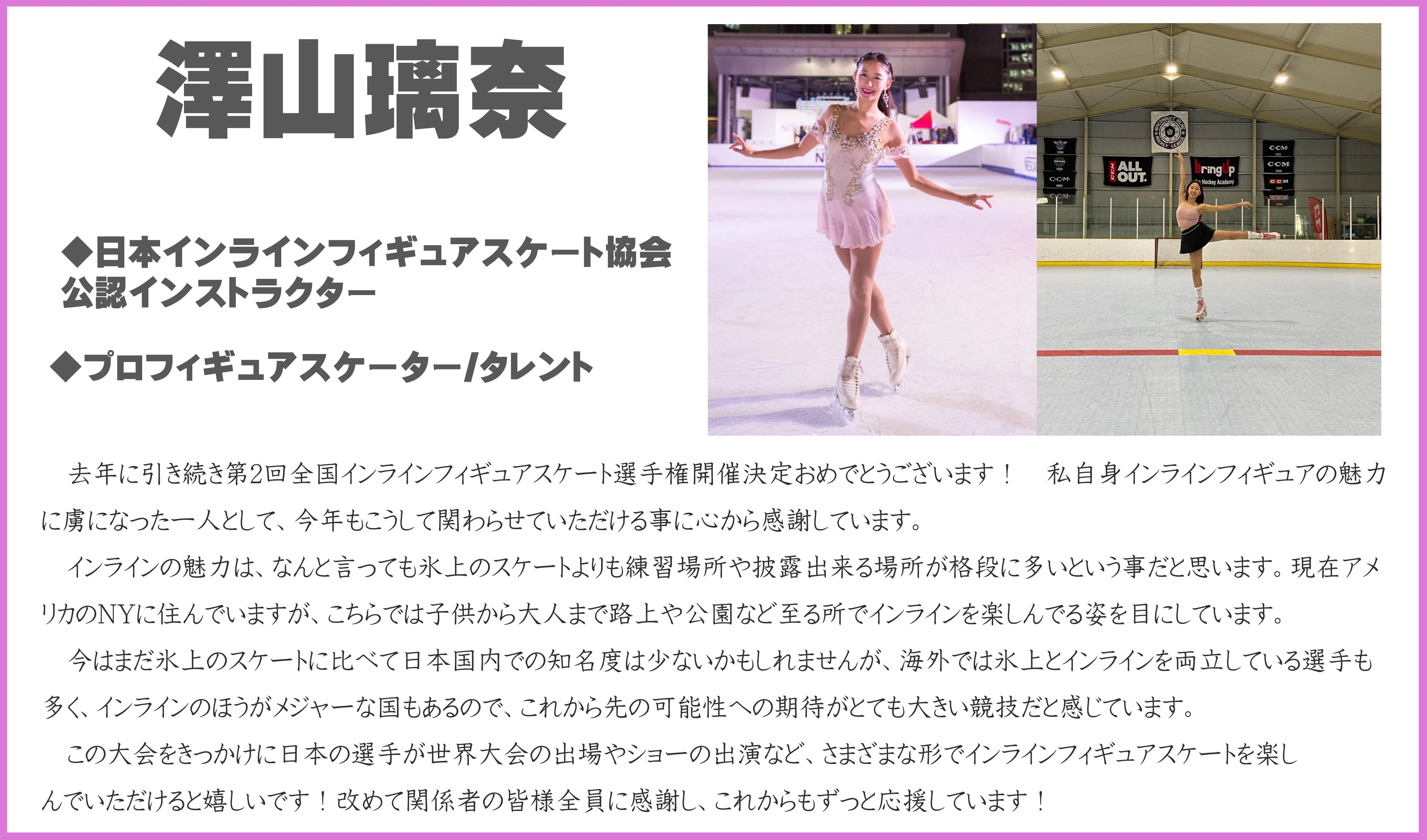 まだまだ新しいスポーツであるインラインフィギュアスケート、ですが協会設立し、全日本選手権を開催しているうちに様々なご支援・ご声援を賜り、その勢いを実感できるようになりました。また、日本各地で「今年習い始めました」というお声も多く頂くようになりました。多くの場所で比較的安価に実施でき、競技でもショーでも多くの可能性を秘めているインラインフィギュアスケートの普及にご賛同頂けるようでしたら是非ご支援を下さいますと幸いです。第2回大阪大会が素晴らしい大会となりますように!